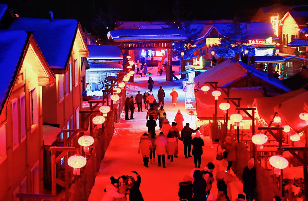 晚上灯亮起来的时候,红色灯笼映衬着皑皑白雪,非常温暖,就像走进了冰雪世界,分分钟出大片,。白天进去可以畅玩雪圈、拍照,晚上进去可以拍夜景和看二人转。