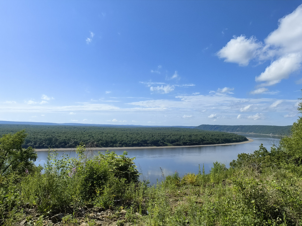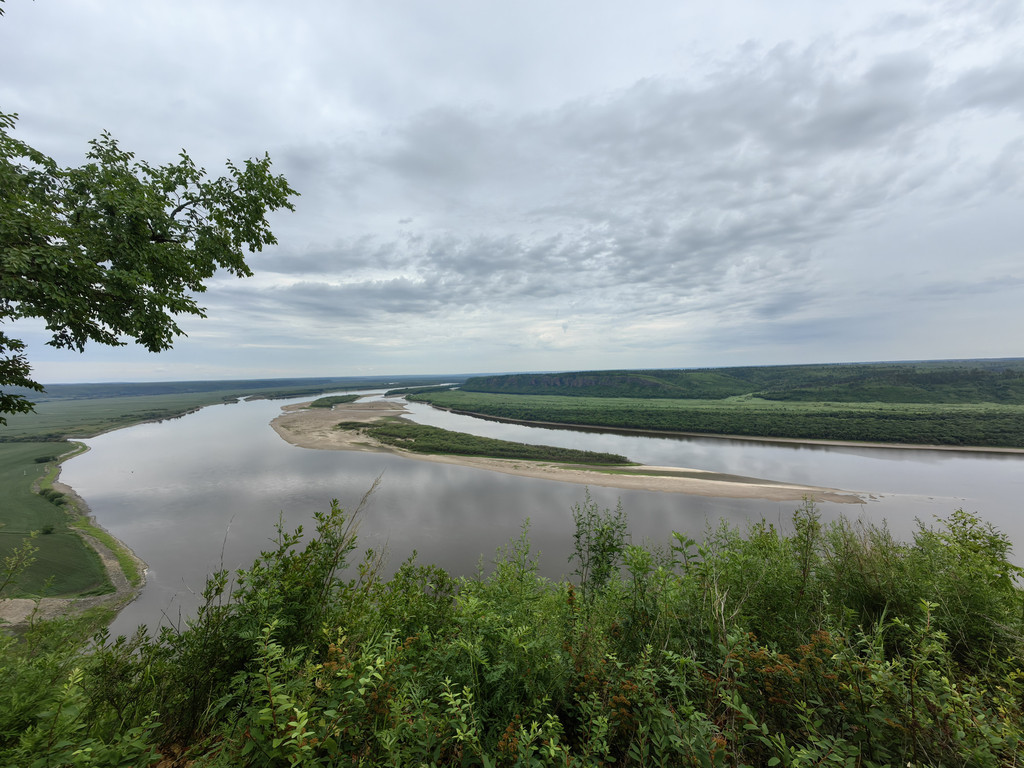 在祖国的最北端有一个由黑龙江水编织的中国结,这便是位于呼玛县的八十里大湾。在画山界江景区游玩后,我们驾车沿331国道行驶,蓝天白云映衬下树木郁郁葱葱,满眼绿色,黑龙江蜿蜒流淌,奇山秀水、钟灵毓秀。到达三卡乡时,八十里大湾展现在我们眼前。
