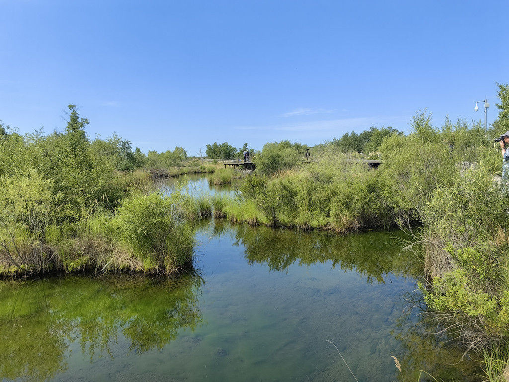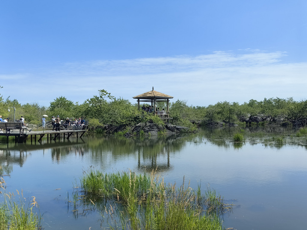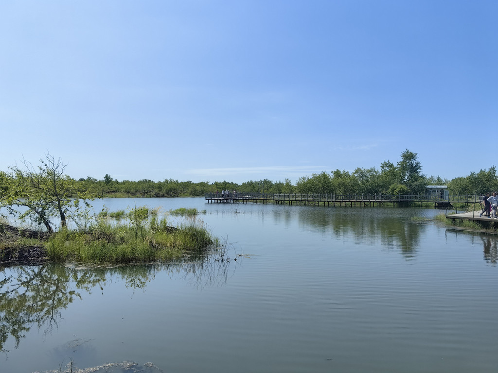 走在蜿蜒的木栈道上,可见湖边绿叶葱葱,清澈的湖水中生长着色彩斑斓的水草。