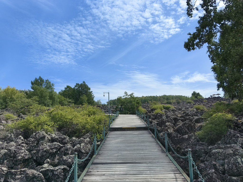走在木栈道上,两边是黑乎乎的石海,还可见到因火山喷发和地震形成的许多石柱,有的如禽似兽,有的如塔似锥,气势雄伟、景象壮观。