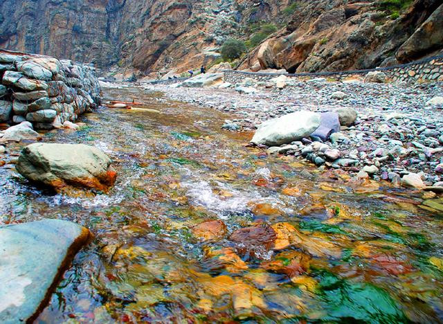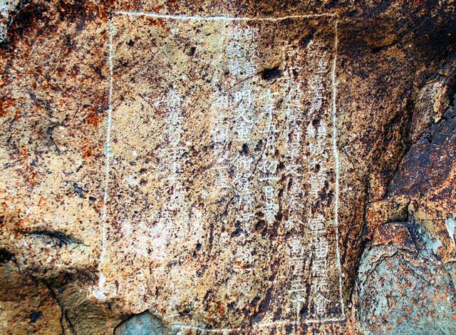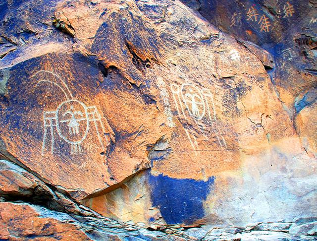 走进贺兰山岩画风景区,是一条长长的沟谷。沟谷中水流不大的溪水潺潺流淌。贺兰山岩画的分布,有着明显的地貌特征,多分布在600多米的沟谷两岸石壁上,约有300多幅,内容大多为人头像,还有马、驴、牛、羊以及狩猎、人手等图像,风格粗犷、质朴,题材广泛,充分反映了古代民族的图腾崇拜。此外,岩壁上还有西夏文的题刻多处。