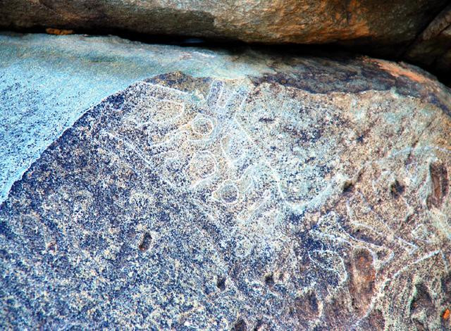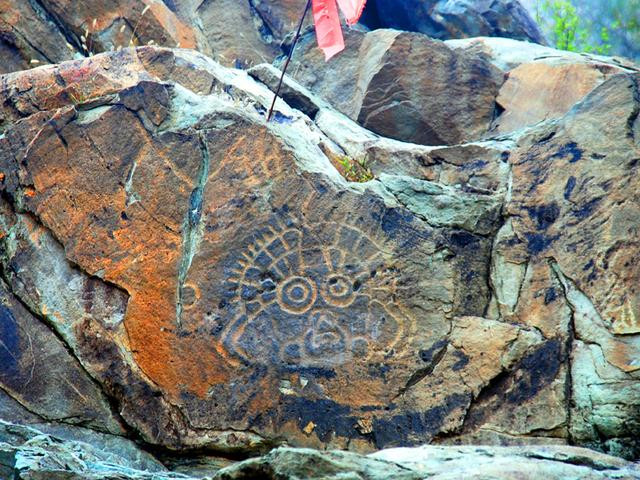 尽管车友们望着石壁上的岩画,听着解说员的讲解,但依然对这些刻在岩石上形象丰富的各种图案,感到非常的神秘和不可思议。顺着山沟走了一段路,来到了位于半山腰中的著名太阳神岩画下。为了能使游客注目,景区还在画的上方插了一面标志性的小红旗。游客在山脚下虽然能远眺这幅太阳神岩画,但是要想近观,还要顺着陡峭的山道爬上山后才能清晰地零距离欣赏。