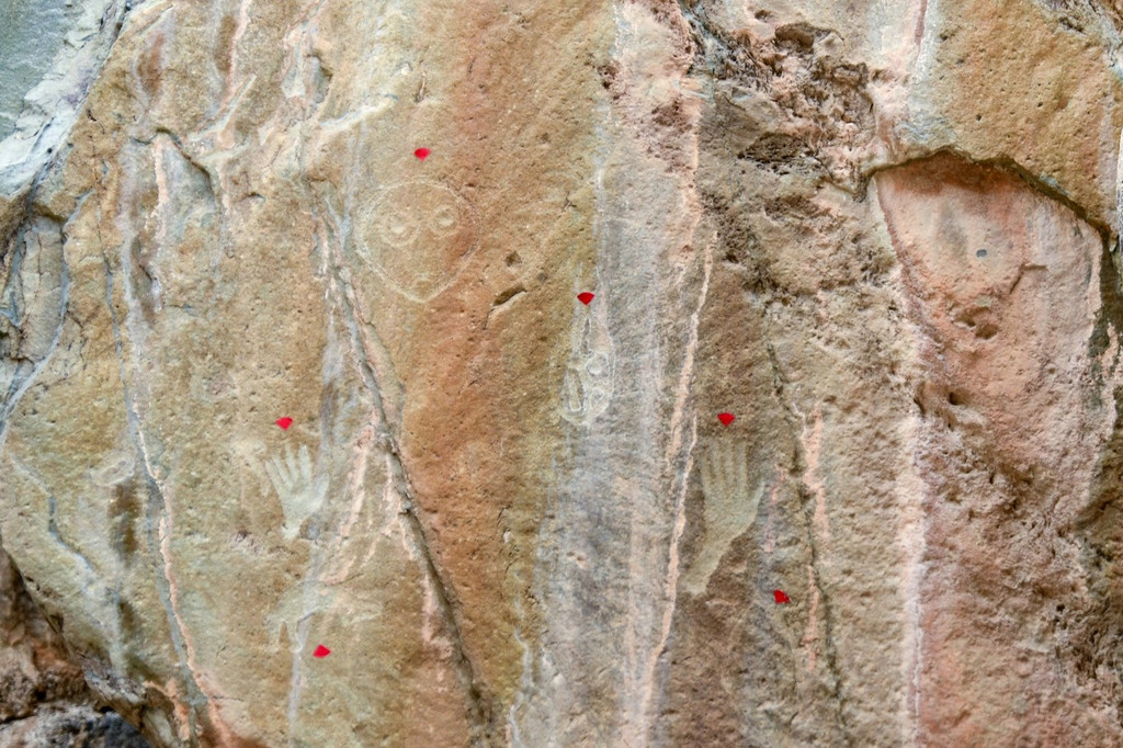 为照片关联地点最上方的“桃形”人面像为重环双眼,代表神灵。两只手大小不一,代表了两个强弱不同的部落。左侧小手边有一个向左的箭头,代表小手的部落将离开此地迁往他处。小手下方有一头牛,向着大手印的方向跪倒,象征臣服,小手部落的财产全部归大手部落所有,有人、神共同作证,并“盖手印”,永远不得更改。两个古老的部落以岩画的方式记录下这一历史事件。