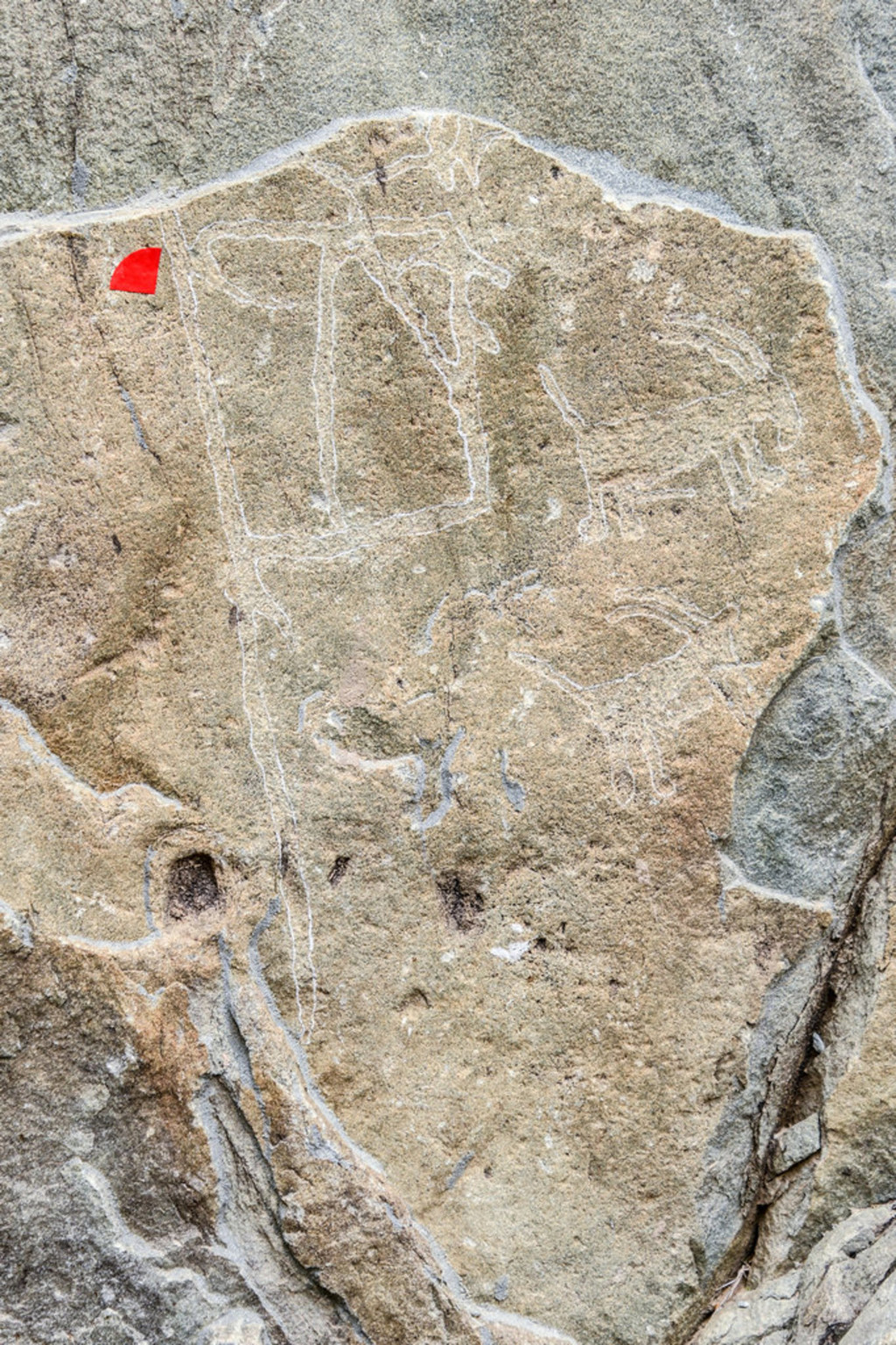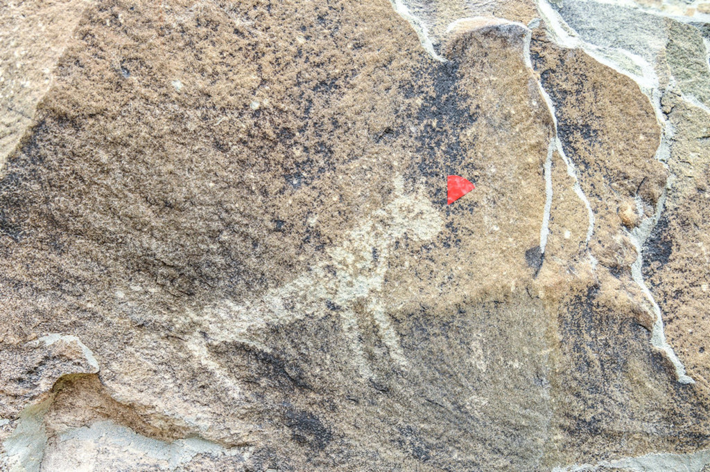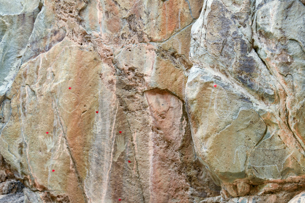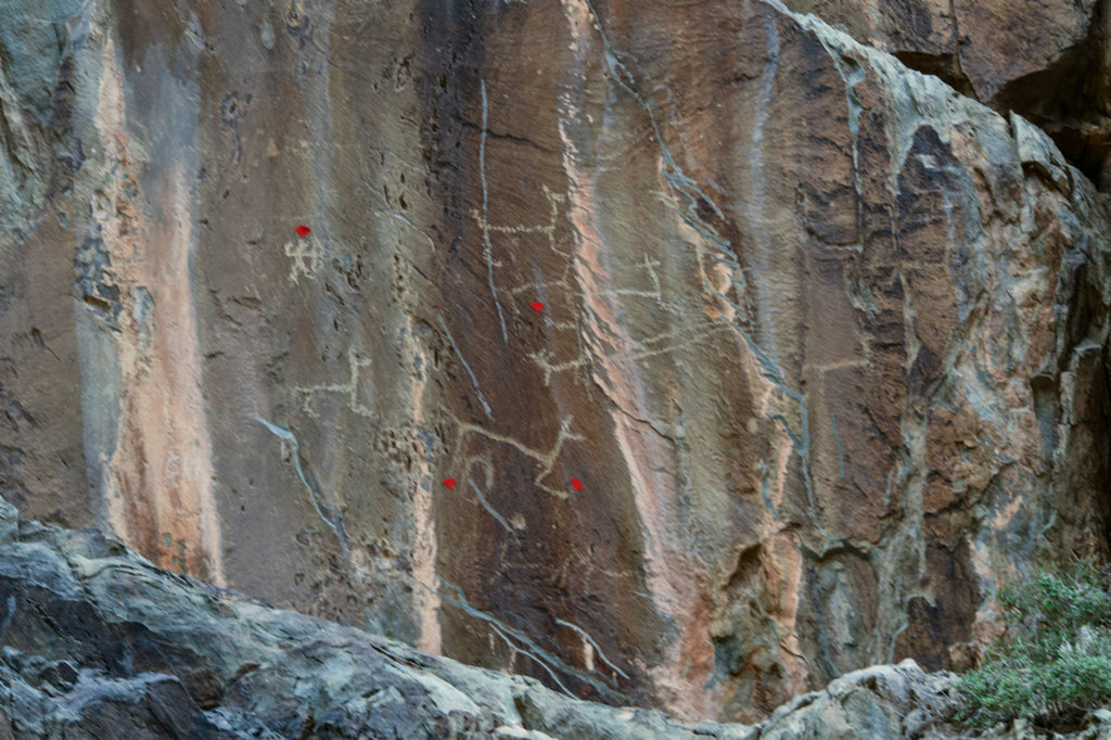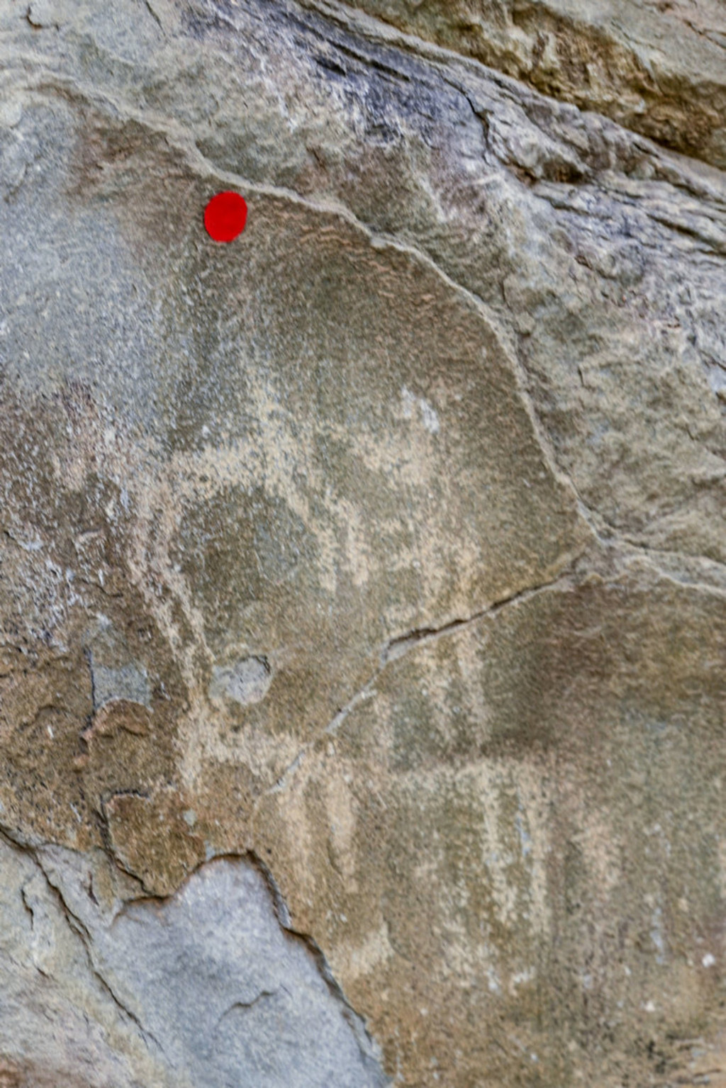 为照片关联地点在穿行沟谷两侧,我们按正时针行走,留意每一个标有红点的地方,那里就是已经确定了有岩画的地方,由于时间的流逝,很多的岩画很浅、很模糊,如果不是有人告诉你,如果不是定睛细瞧,真是无法领略到这个凿刻和磨制出来的画廊的妙处。