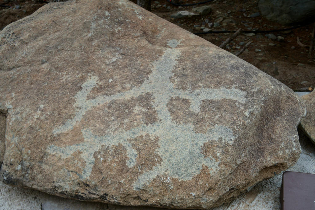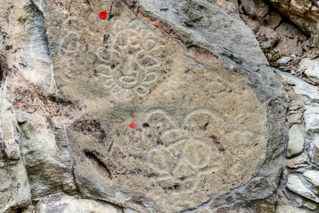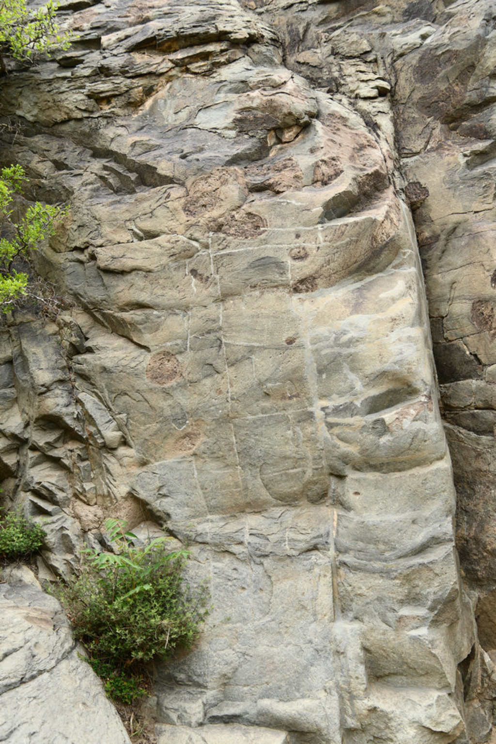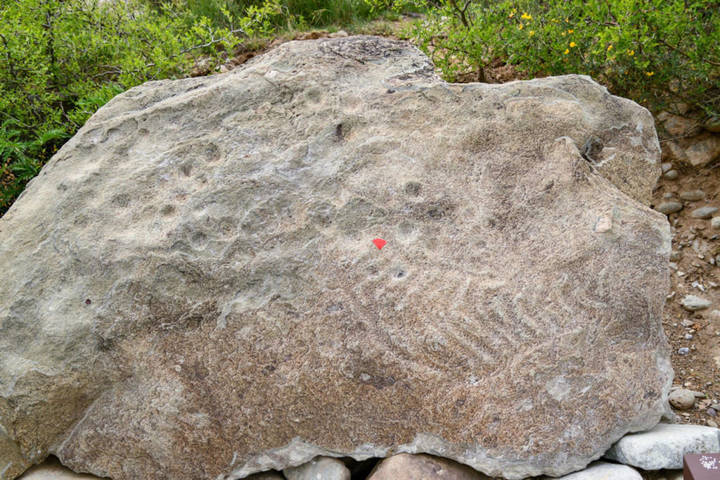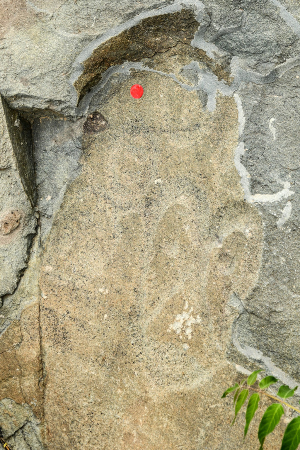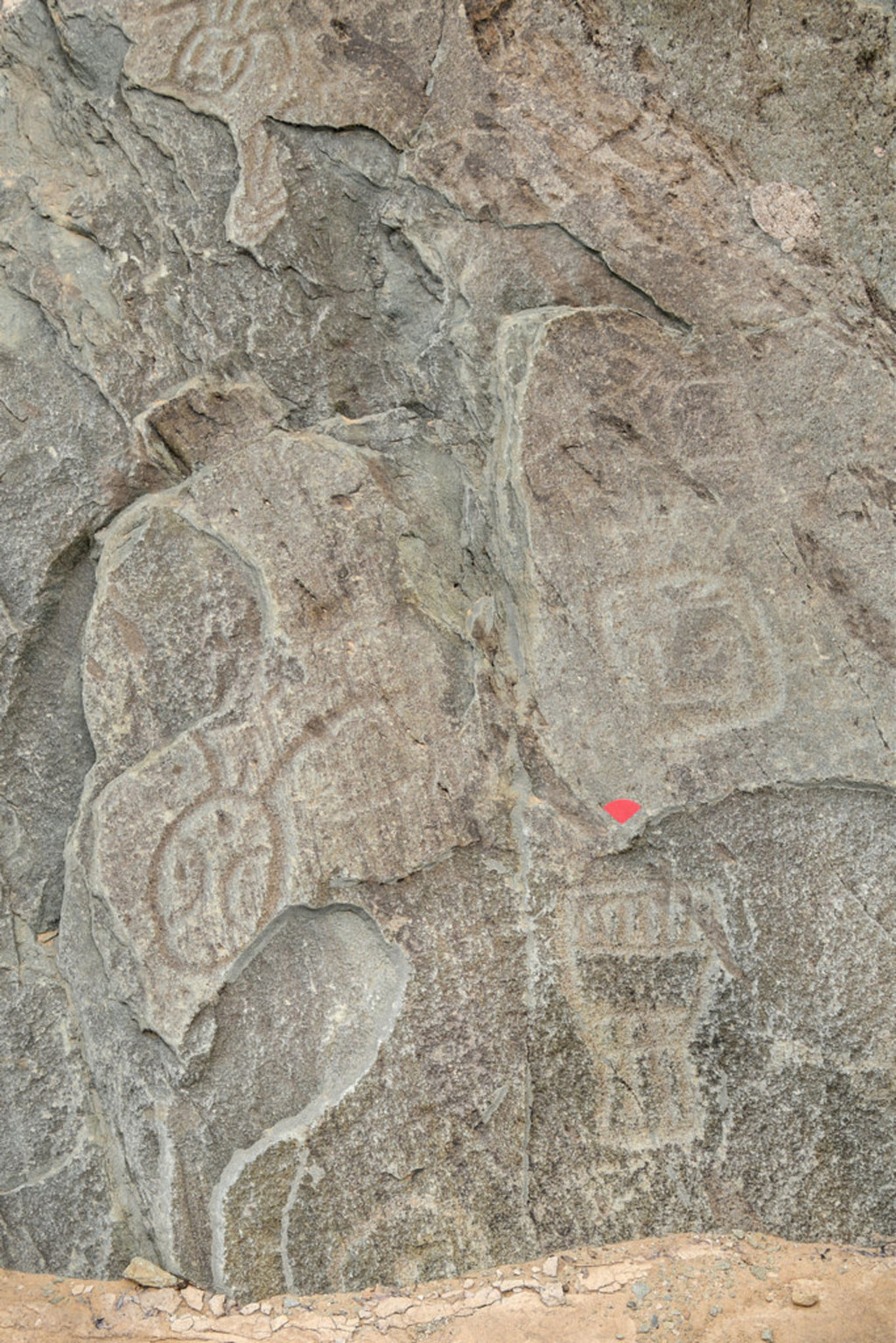 为照片关联地点在穿行沟谷两侧,我们按正时针行走,留意每一个标有红点的地方,那里就是已经确定了有岩画的地方,由于时间的流逝,很多的岩画很浅、很模糊,如果不是有人告诉你,如果不是定睛细瞧,真是无法领略到这个凿刻和磨制出来的画廊的妙处。