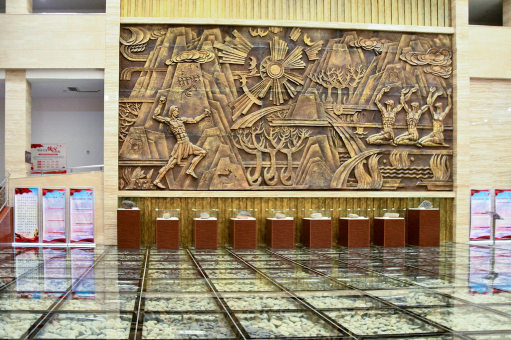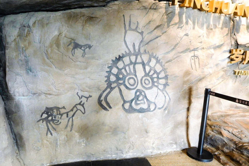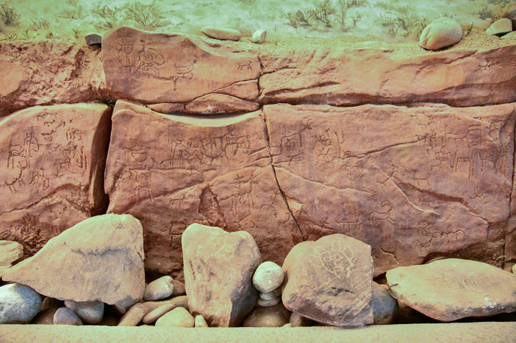 岩画馆展区面积2000平米,一楼大厅中央的透明玻璃地板下有一幅由石块组成的世界地图,上面标识了世界各地的岩画区。