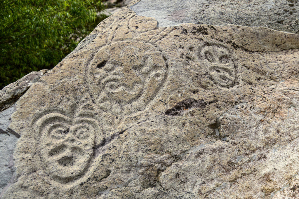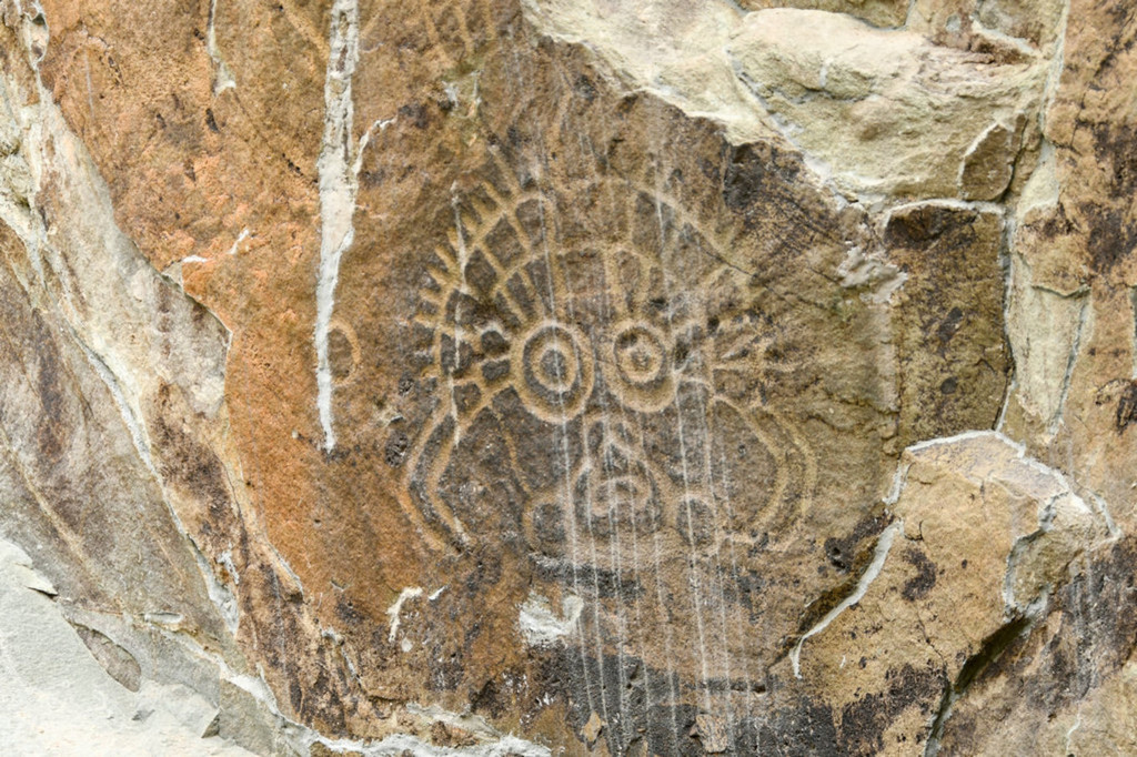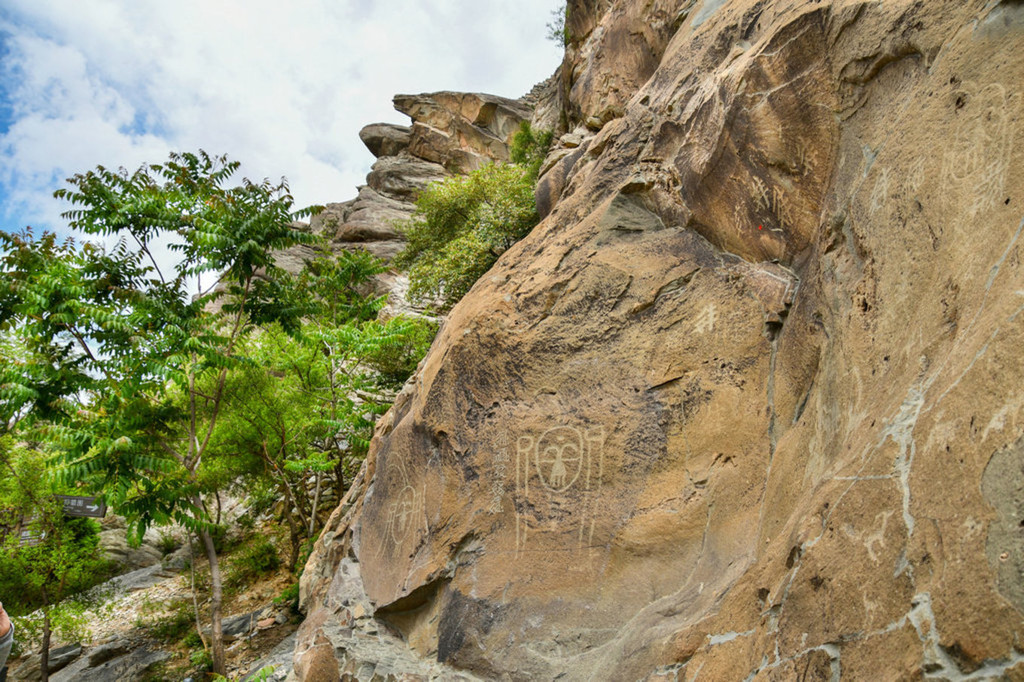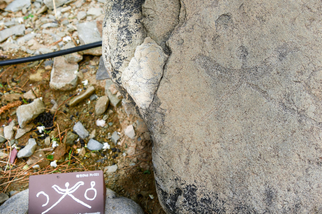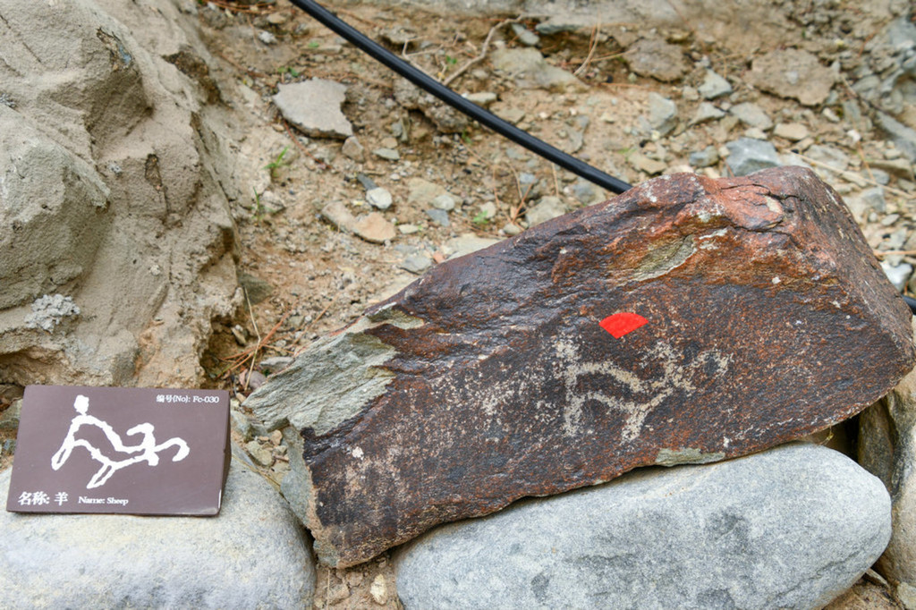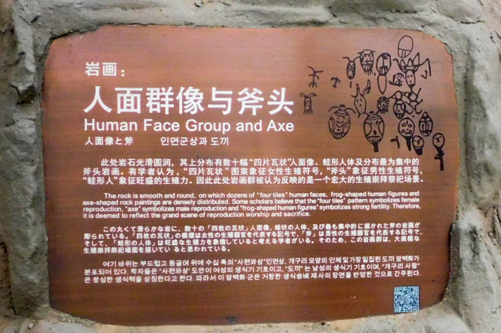 为照片关联地点圣像画:此处岩画密集,刻制了许多造型奇特的人面像岩画及符号岩画。最引人注目的是石壁上的众神面像,个个造型独具,神情并茂。可惜此地曾修渠引水,致使该处岩画遭受严重损坏,千古遗存,为之扼腕。