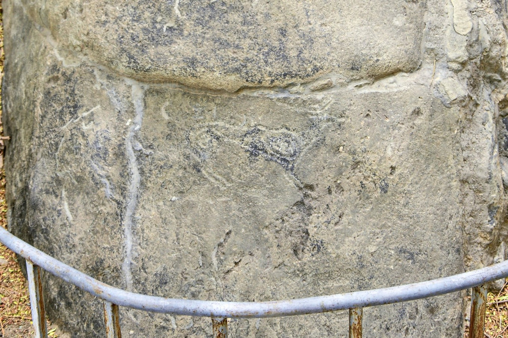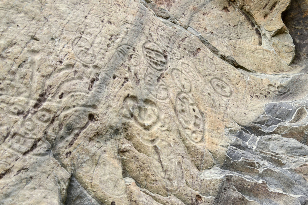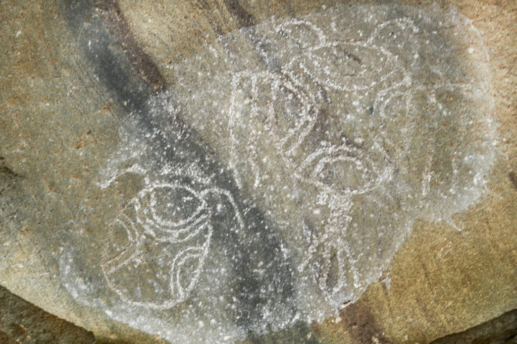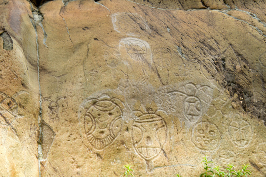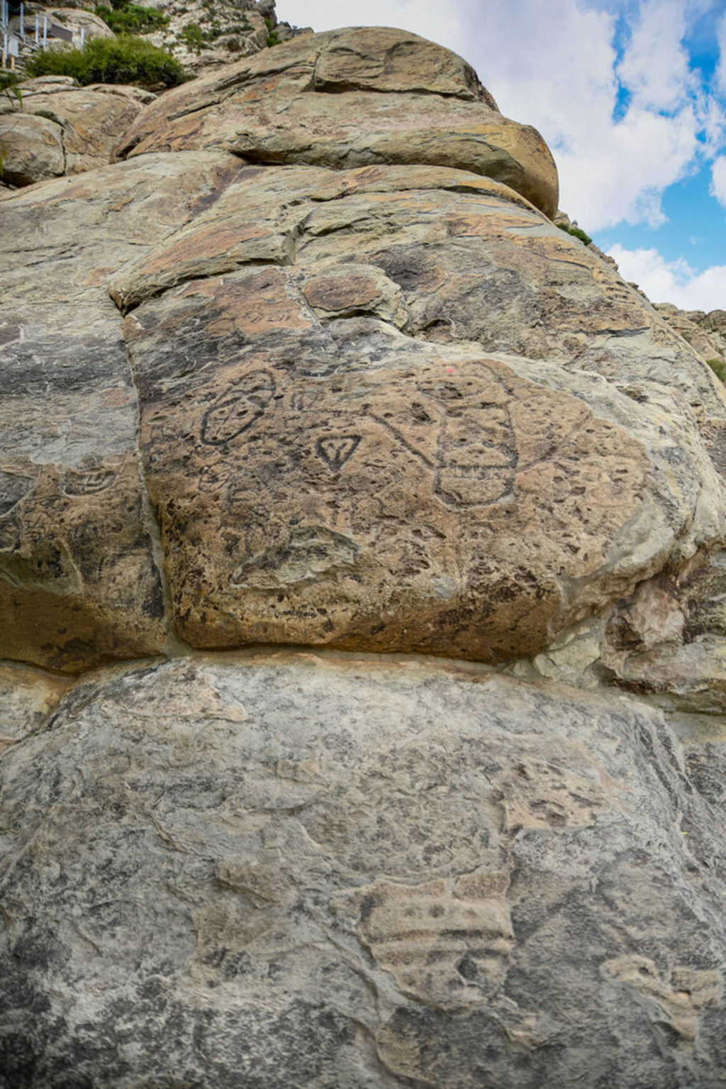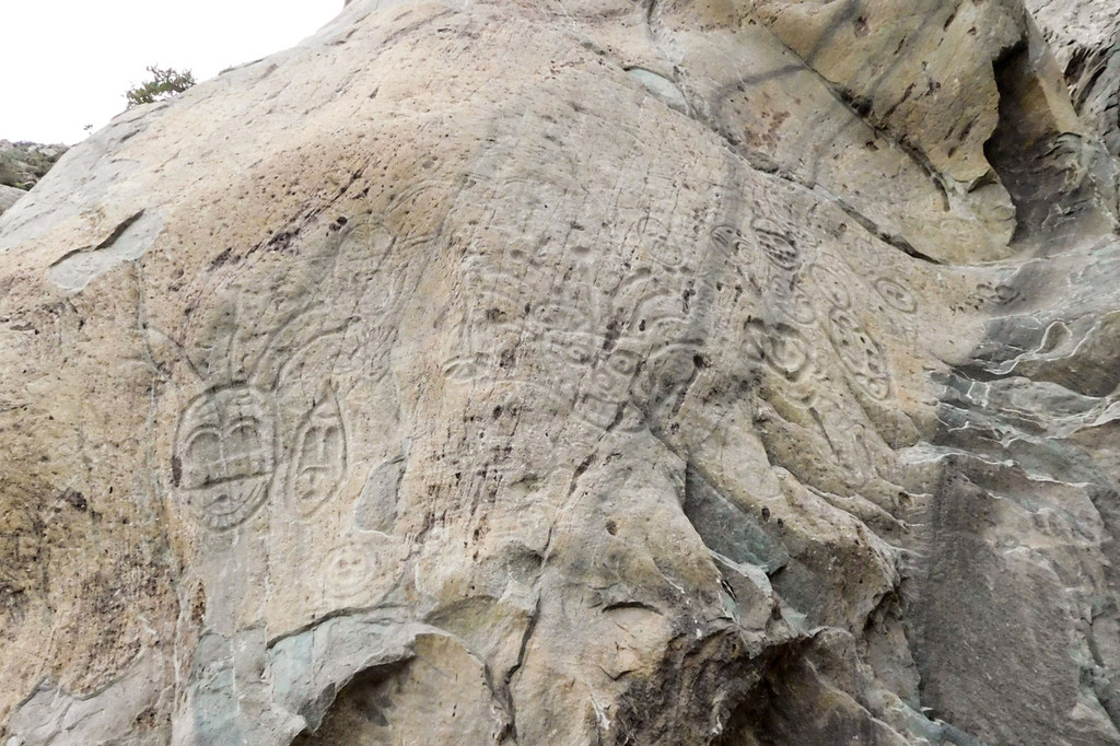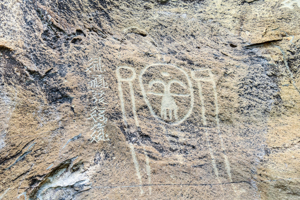 符号与人面像:此处岩石饱经沧桑,风化严重。幸存的画面也是漫漶不清,仔细观之,有人面像、羊、牛、马及大量符号等。右边最大的一具人面像造型奇特,刻度深约1cm,眼部与嘴部阴刻,两颊两侧有上扬的胡须。