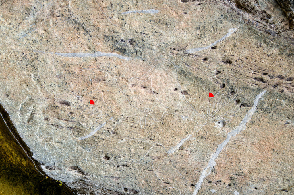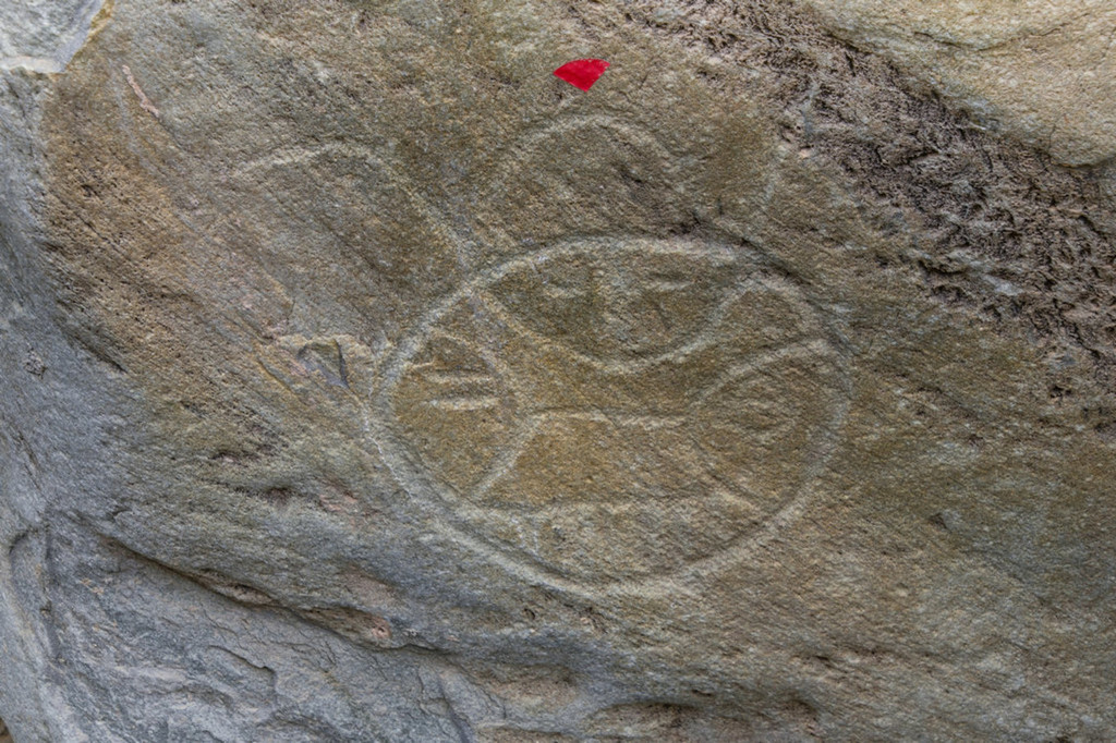 “女人花”,见红箭头。石壁上有上下两副人像画,上面一幅人像由十三个花瓣围成,面部轮廓由“四片瓦状”构成,象征女性。下一幅人面像头顶有羽毛状装饰物,嘴角有胡须,象征男性。这幅岩画中女性高高在上,显示了地位的尊贵,似为母系社会的文化遗存。