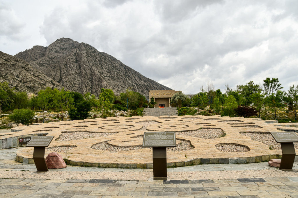 为照片关联地点银川世界岩画馆从检票口上台阶,往里走300米左右,直行就可以看到太阳神广场,太阳神广场”,它是以贺兰山岩画中最具代表性的岩画 - 太阳神命名的。只见地上有一个巨大的立体雕刻,乍看一眼不知是什么,再仔细看,依稀可见一个“太阳神”的脸部图案,它是以1:100的比例放大制作的,等进入景区看过太阳神岩画之后再来看就会更清楚。