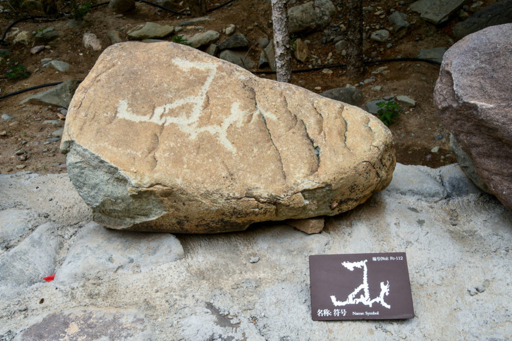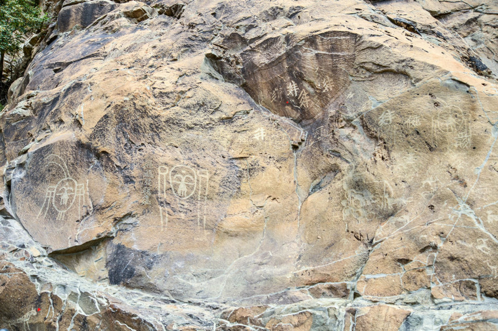 岩画群:此石坡光滑完整,位居山口要冲位置,面东朝阳,曾是先民们创作岩画的良好基岩,该石之上岩画众多,内容丰富,题材多样,有人面,巫师,娱舞人形......似乎给我们展现了当年神圣、庄严又不失生活情趣的祭祀场面。但因历史太悠久,画面已风化、磨损。故观看有欠完整、清晰。