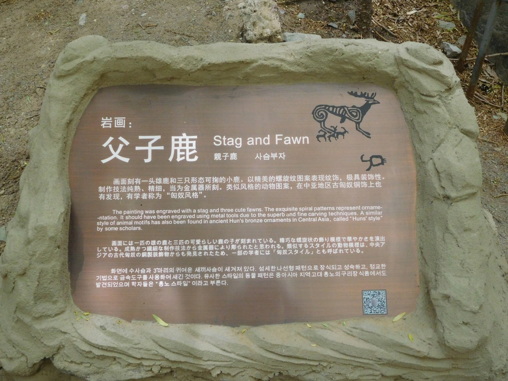 为照片关联地点画很粗燥,当然,这是远古时代遗留下来的作品,其实,说是远古,也不算很远,大部分是春秋战国时期的北方游牧民族所为,而他的意义,不至于美学,而在于对那个时代的人审美价值观的理解,他们追求什么、喜欢什么、热爱什么、崇拜什么?约有千余幅个体图形的岩画分布在沟谷两侧绵延600多米的山岩石壁上。画面艺术造型粗犷浑厚,构图朴实,姿态自然,有很强的写实性。大部分为人首像,还有牛、羊、马、驴、鹿、鸟、虎、狼等动物图形。