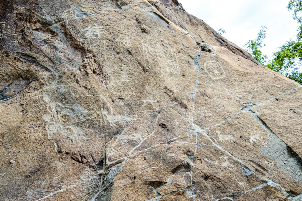 为照片关联地点为照片关联地点为照片关联地点为照片关联地点猴头像:此处有一人面像岩画,其左眼深陷,右眼突出,头戴小帽,造型奇特,再看其上上体,高矮有序,形如手之五指,驻足联想,似为如来佛压在五行山下的孙悟空。