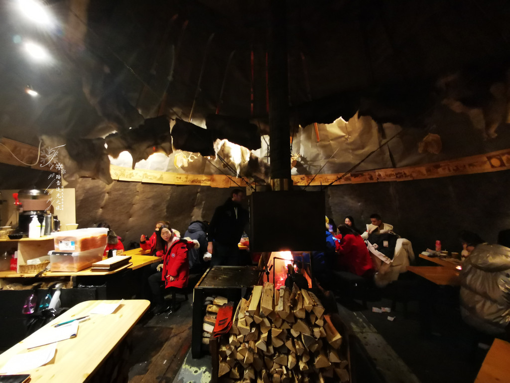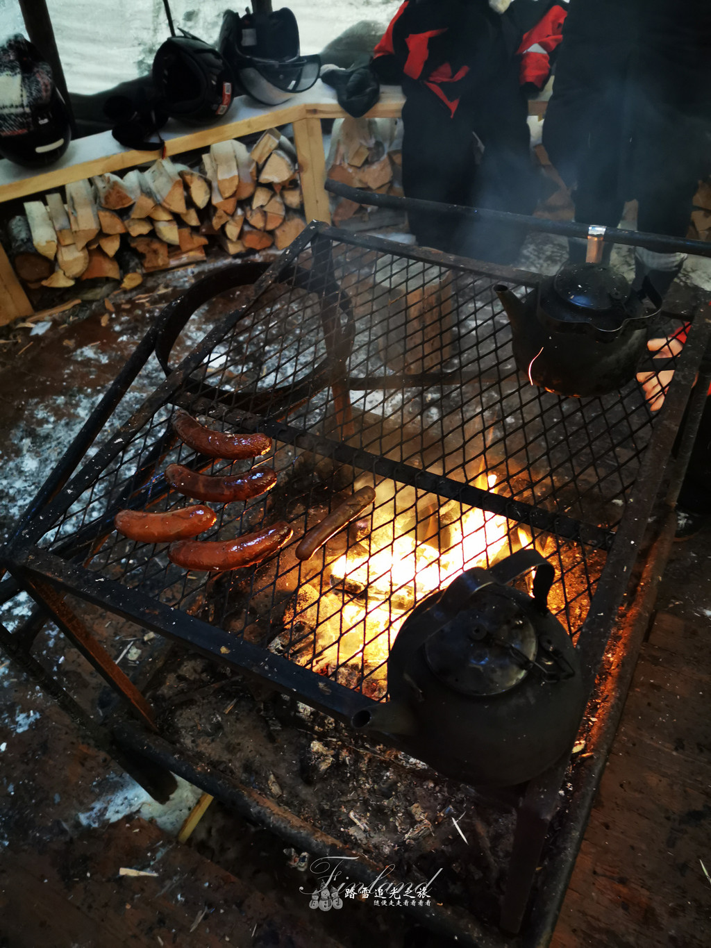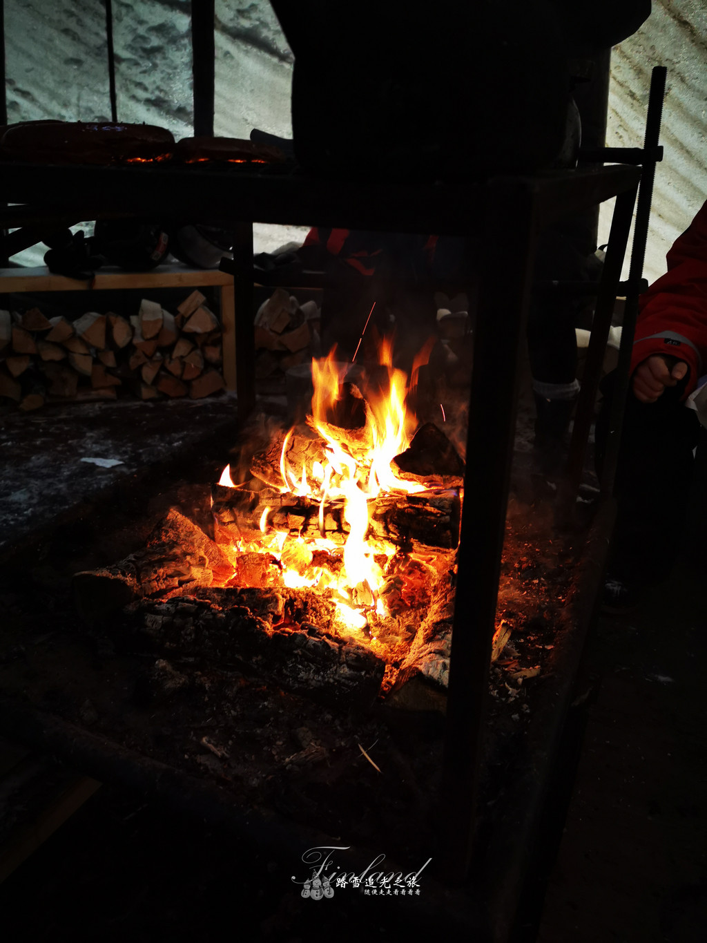 当我们欢乐的在雪地撒欢时,小哥已经默默去到附近的帐篷中生火为我们准备热饮和烤香肠了。