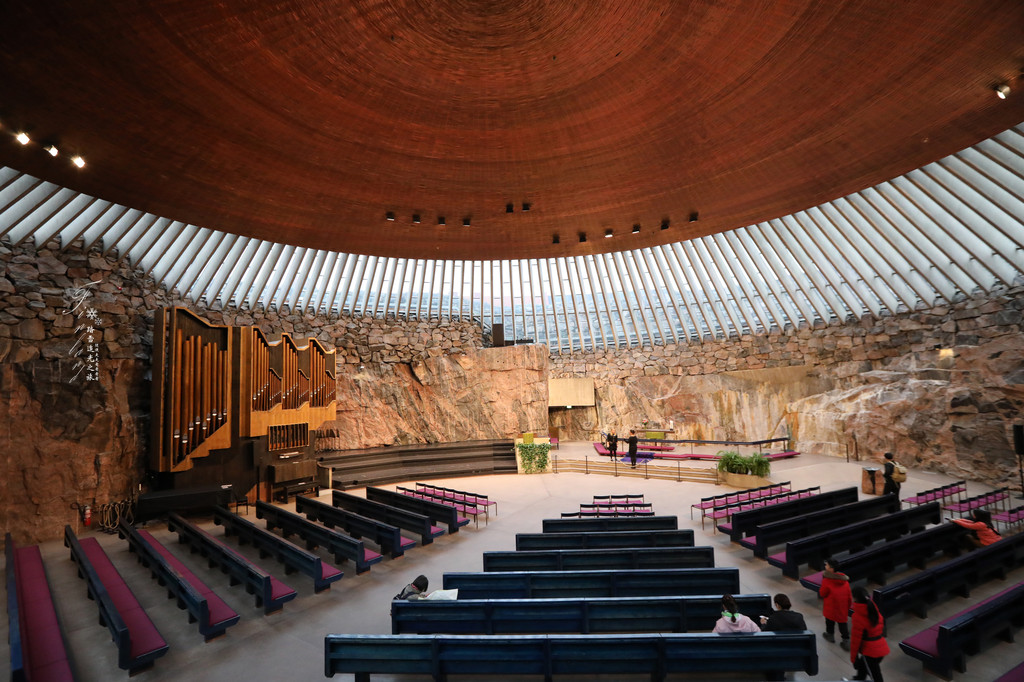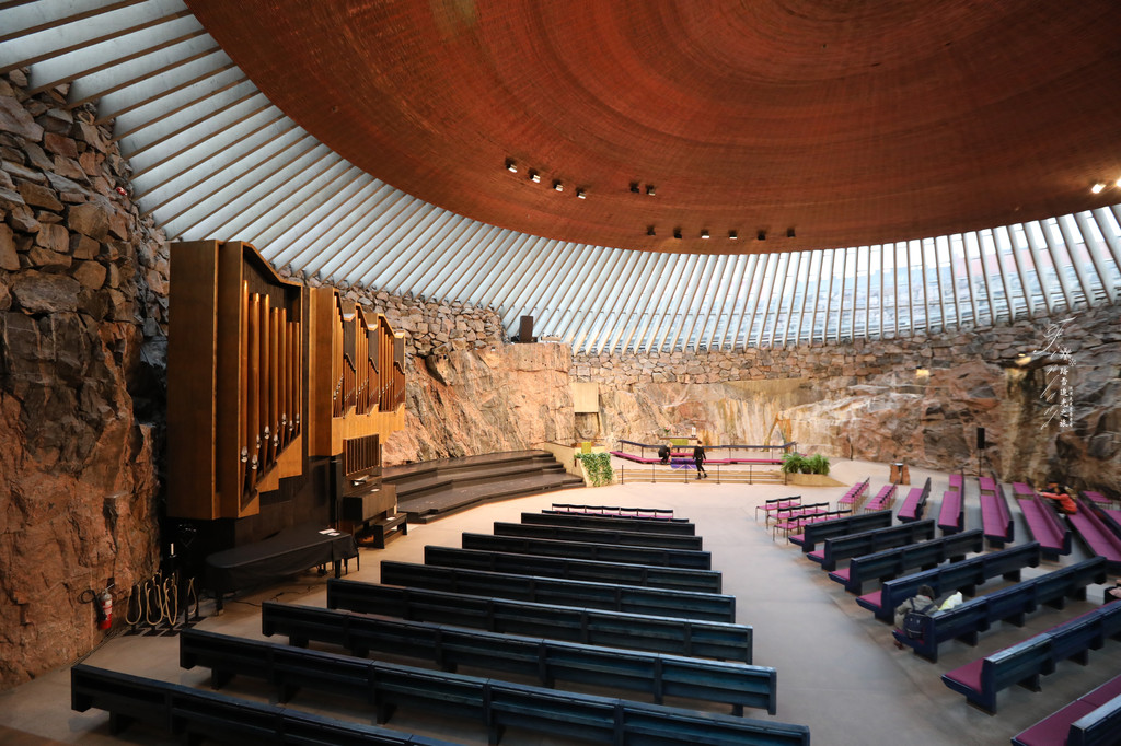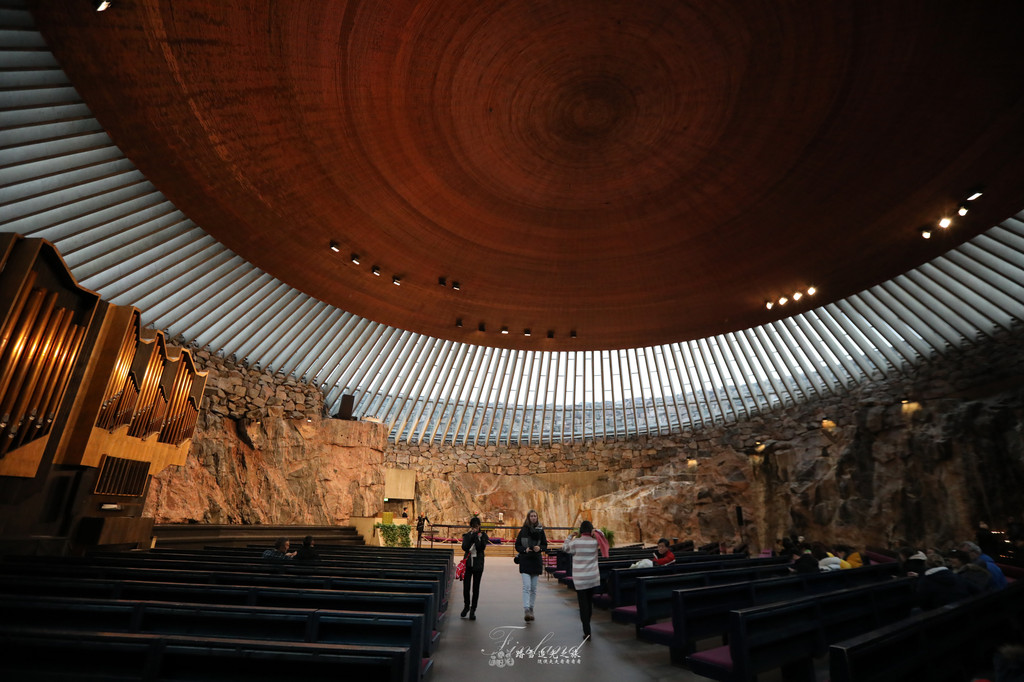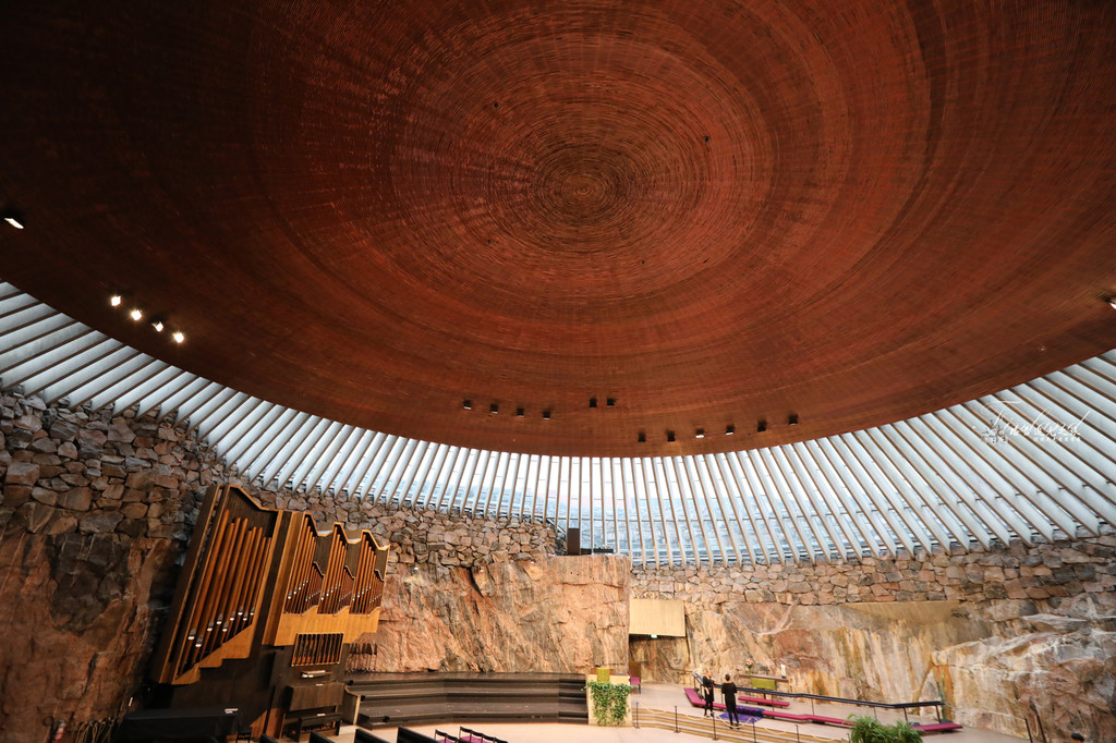 教堂的顶是由二十二公里的铜条盘绕而出,直径24米,再由100条放射状的3寸红铜梁柱支撑,再镶上玻璃,采光极佳。这座世界唯一建在岩石中的教堂于1969年完工,独具一格的设计成为赫尔辛基最受欢迎的旅游景点之一。