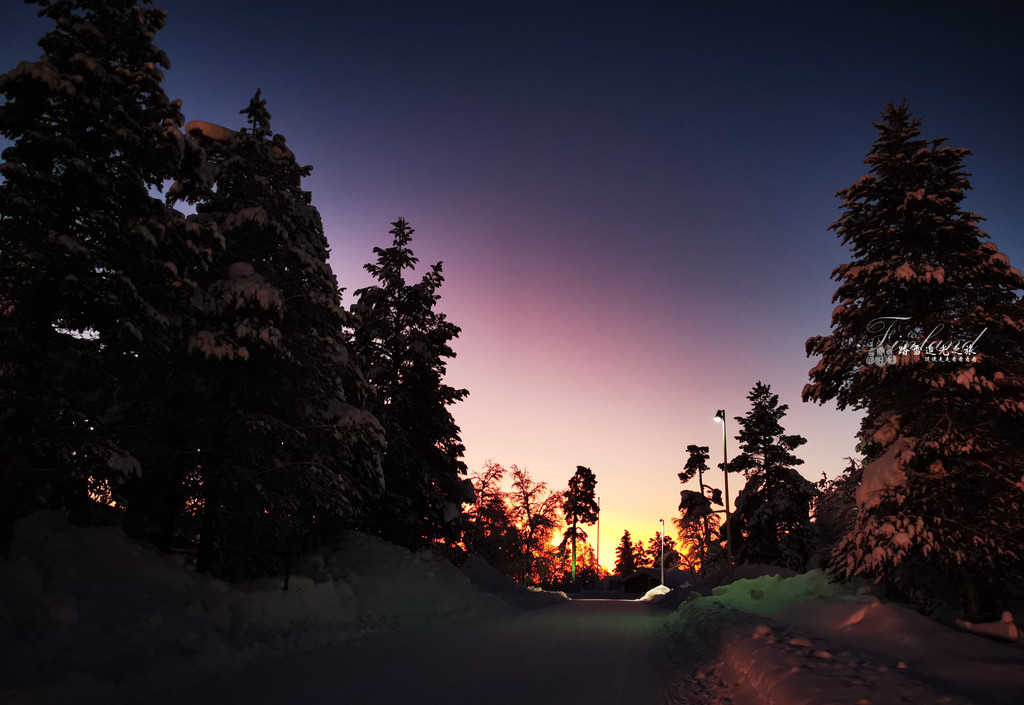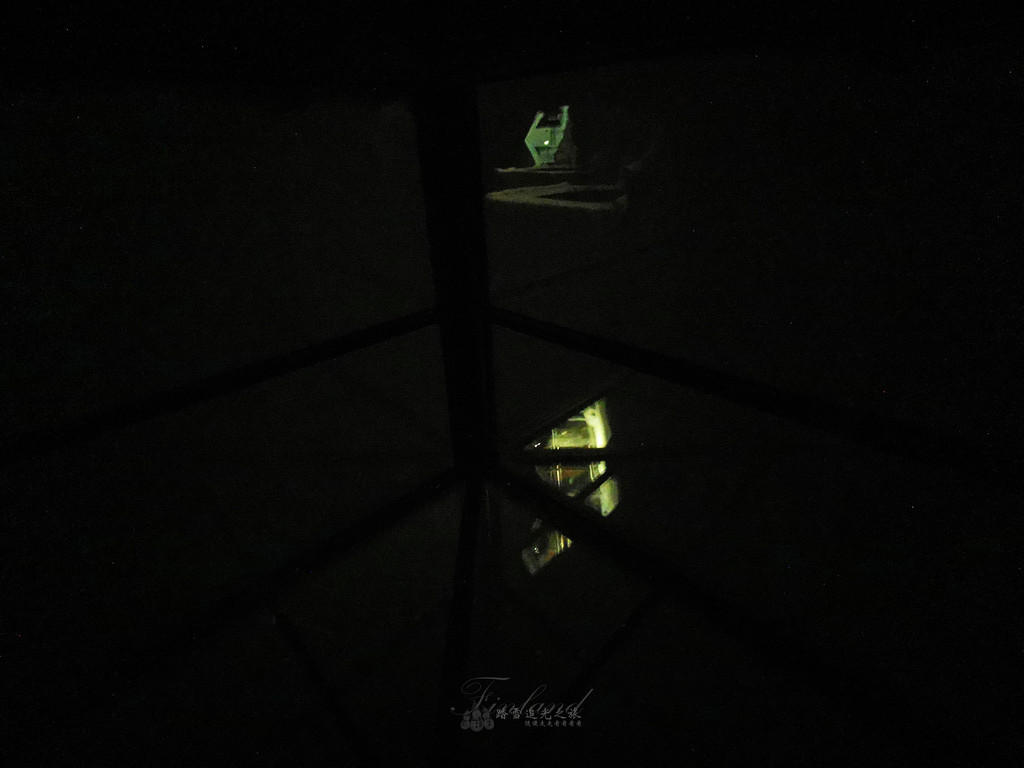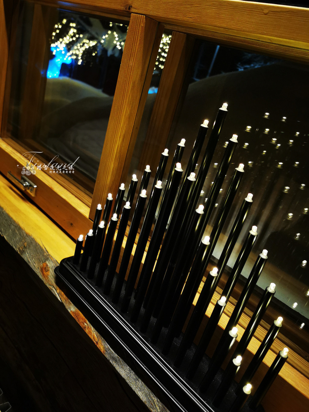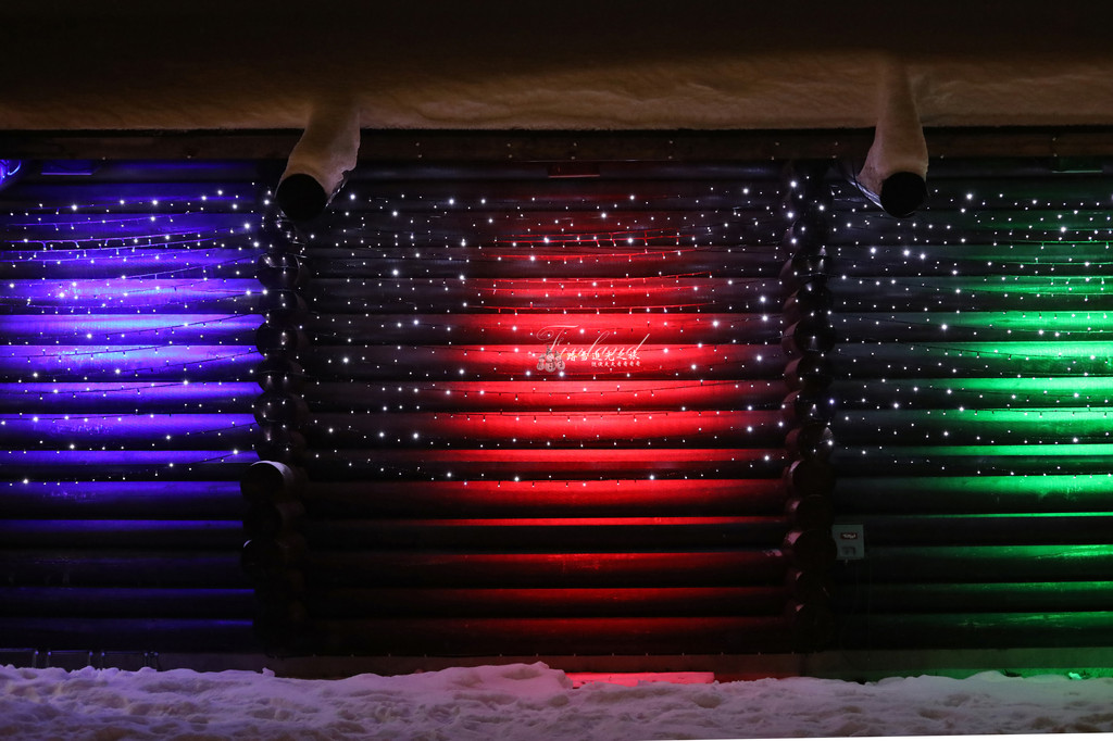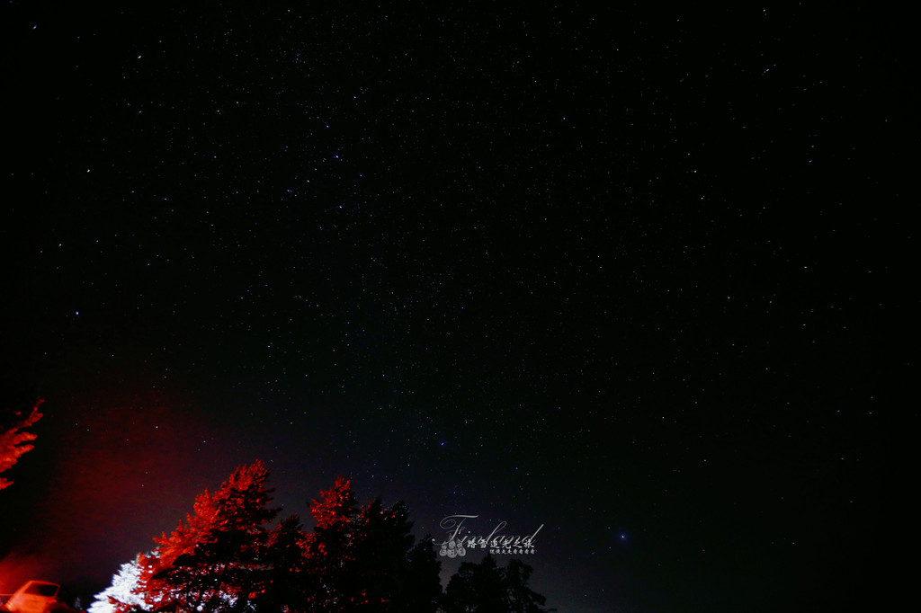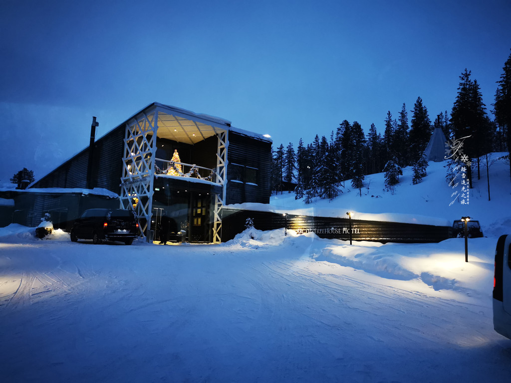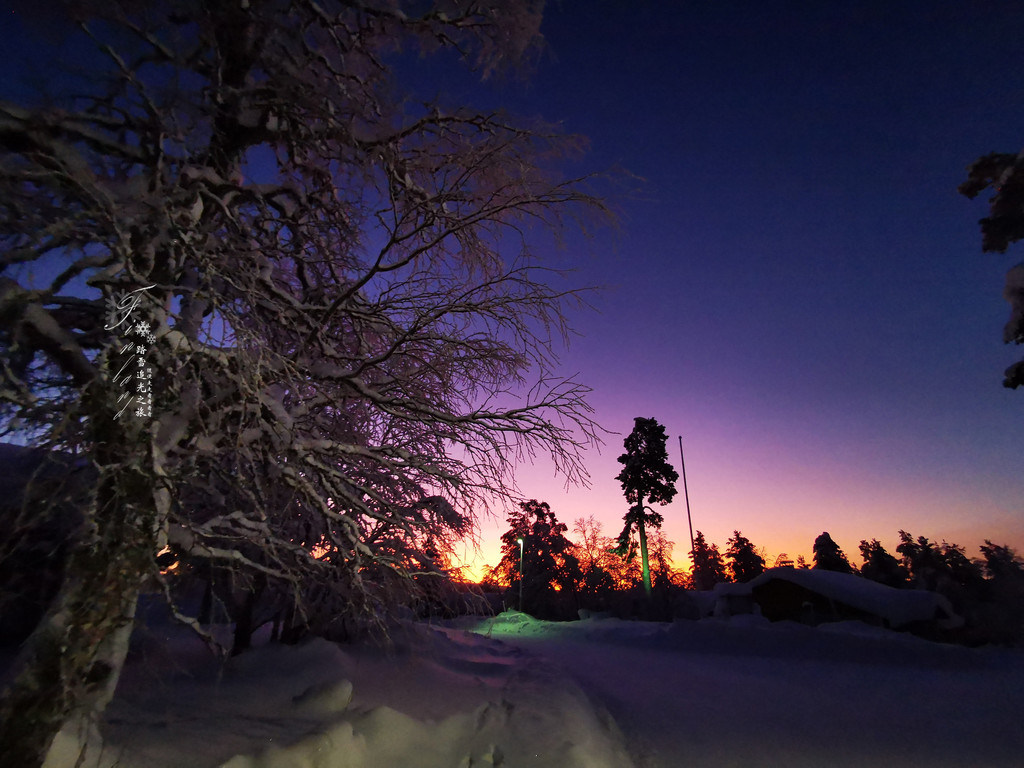 回去的路上还时不时观察着天空,不过村里的光源较多,哪怕是我们小屋后面的树林也被打上了各色灯光,因此除非极光指数特别高,不然很难观察得到。