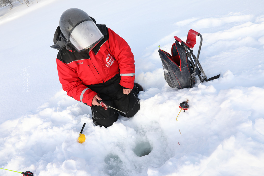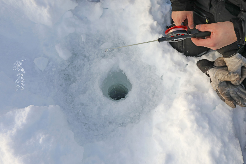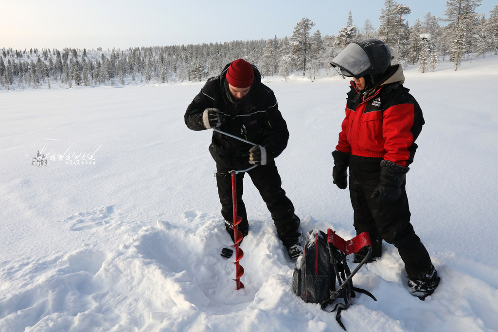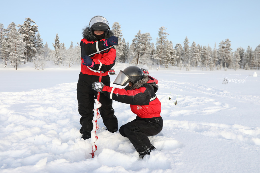 小哥拿出工具,开始教大家打洞冰钓,不得不说打洞虽然也是用巧力,但是对于女生而言还是有点难度,冰钓也就个体验,大家也不会零下十几度坐那儿等,我们也就钻了2,3个小冰洞后欢乐的拍照去了~