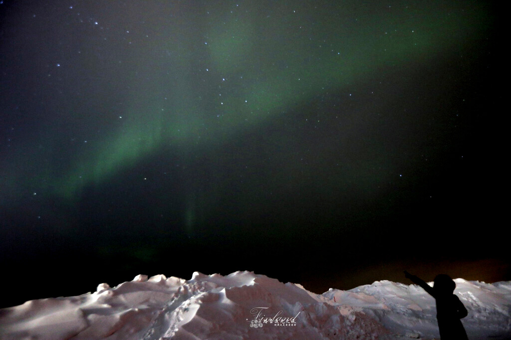 小姐姐提议我们出发去下一站,之后开了半个多小时的路程来到伊瓦诺附近,车停在一个湖边,大家小心翼翼下到湖面上,小姐姐同样准备了热饮和饼干为大家驱寒,大概几分钟后小伙伴和妈妈抵不住寒冷,就先回车上去了,我和豆豆继续等待,小姐姐送她们上车后又回来等我们,聊着天我又给她看了上午的照片,小姐姐虽然也不能确定但也说有可能是,因为不确定是否后面有其他光源,如果没有光源那肯定就是了。的确,在我们站的湖面上虽然也比较暗,但是因为周围有公路,只要有车开过,光线就特别强,会照亮半边天空,因此有时候的确容易混淆,毕竟自从了解到极光有时肉眼可见的颜色较淡之后,总觉得看那儿那儿都有点像。但是一般光源会紧贴着地平线,而极光则是会浮在半空中,就好像这样~