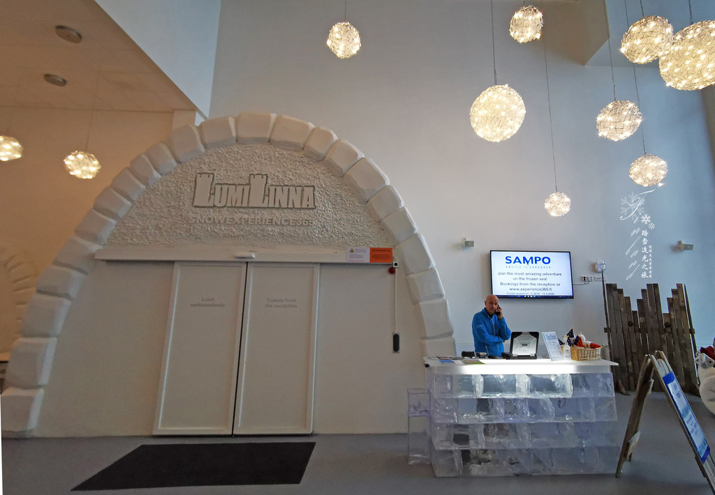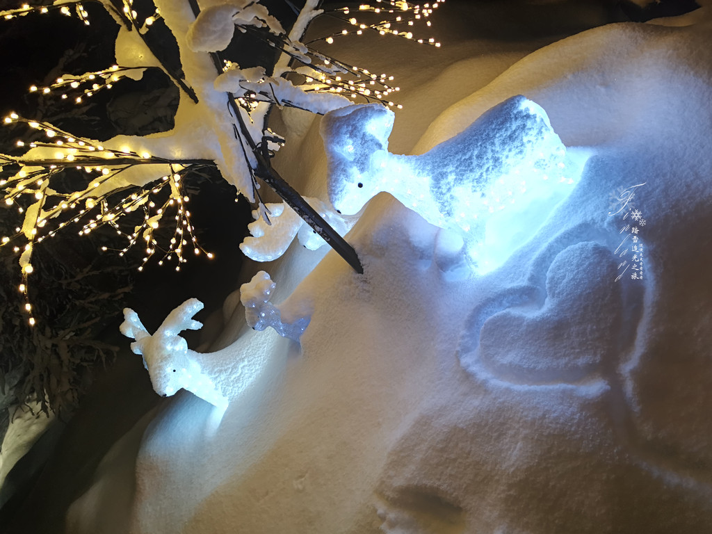 吃完虽然时间尚早,但是外面游客明显少了许多,这时的雪人不用排队等候,可以随意抱着玩耍啦~ 此时室外的北极圈线被雪覆盖,因此上方的那道蓝色灯带就显得格外显目~
