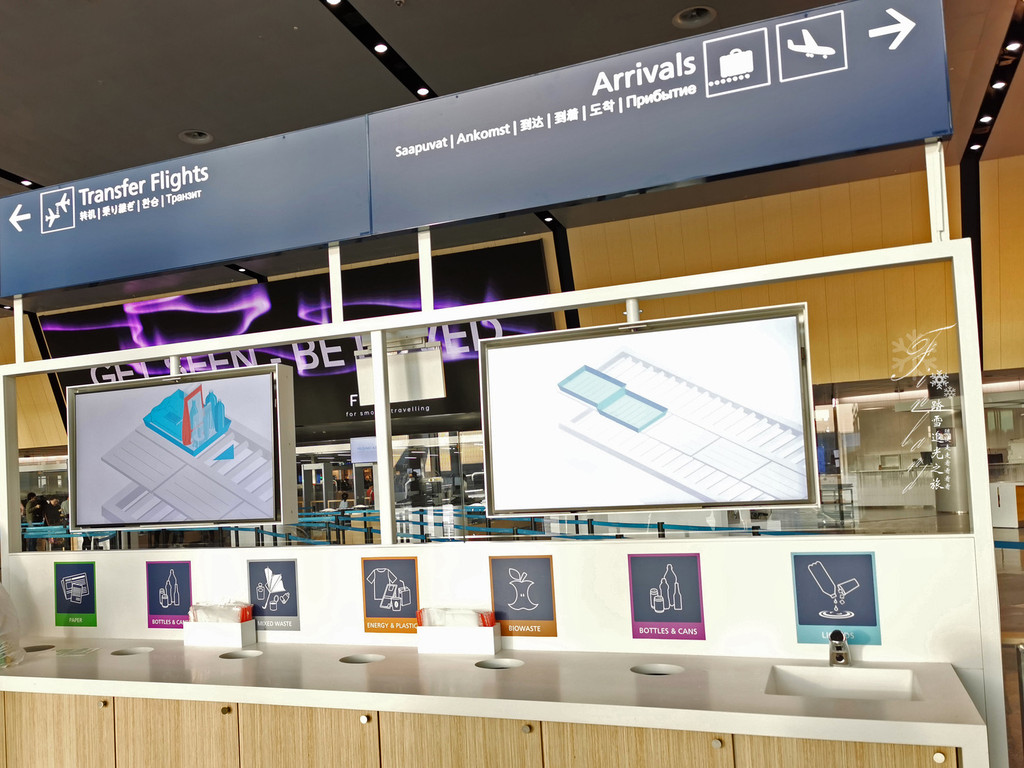 10小时不到顺利抵达赫尔辛基,转机时还是要再过一遍安检,这里有倒水、液体置物袋和丢置垃圾的操作台,提示还是很清晰明了。