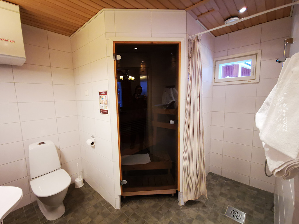 小木屋简朴原始,洗手间也不大,但窗前一盏小夜灯充分体现了北欧人满满的生活仪式感。