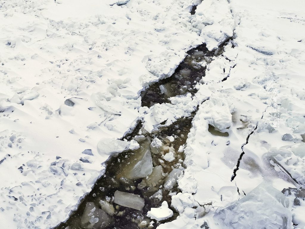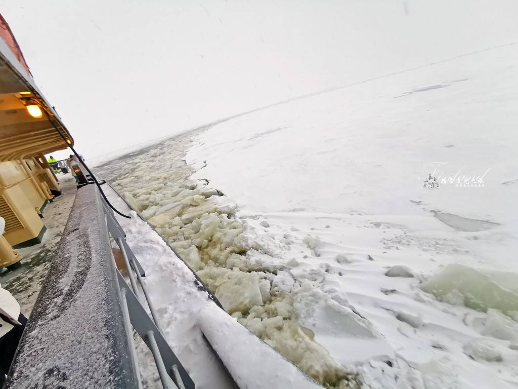 开出去一段距离后,破开的都是些整块整块的大冰。差不多一小时后,船抵达浮冰的地点。