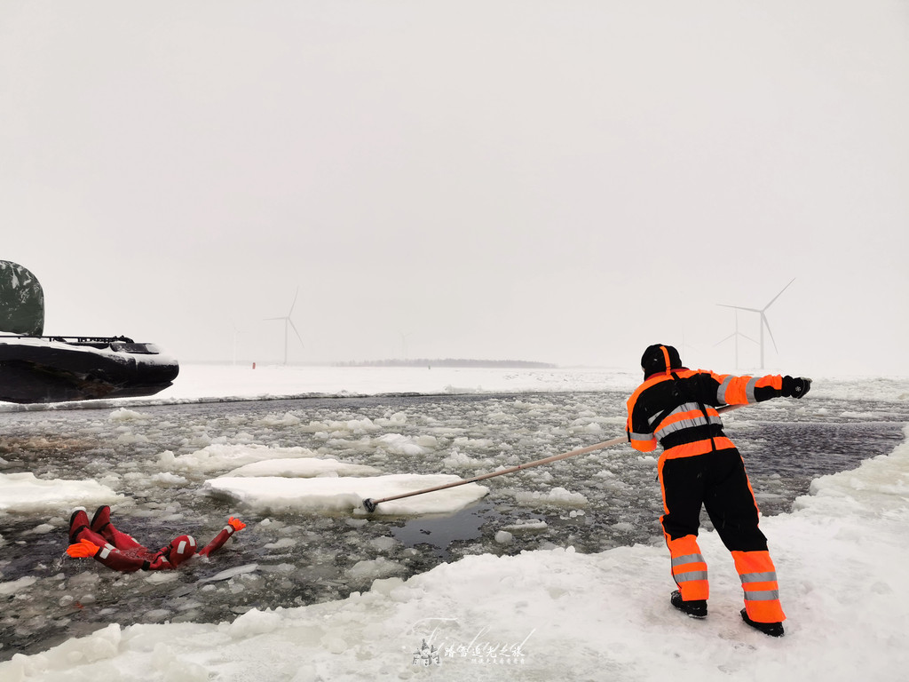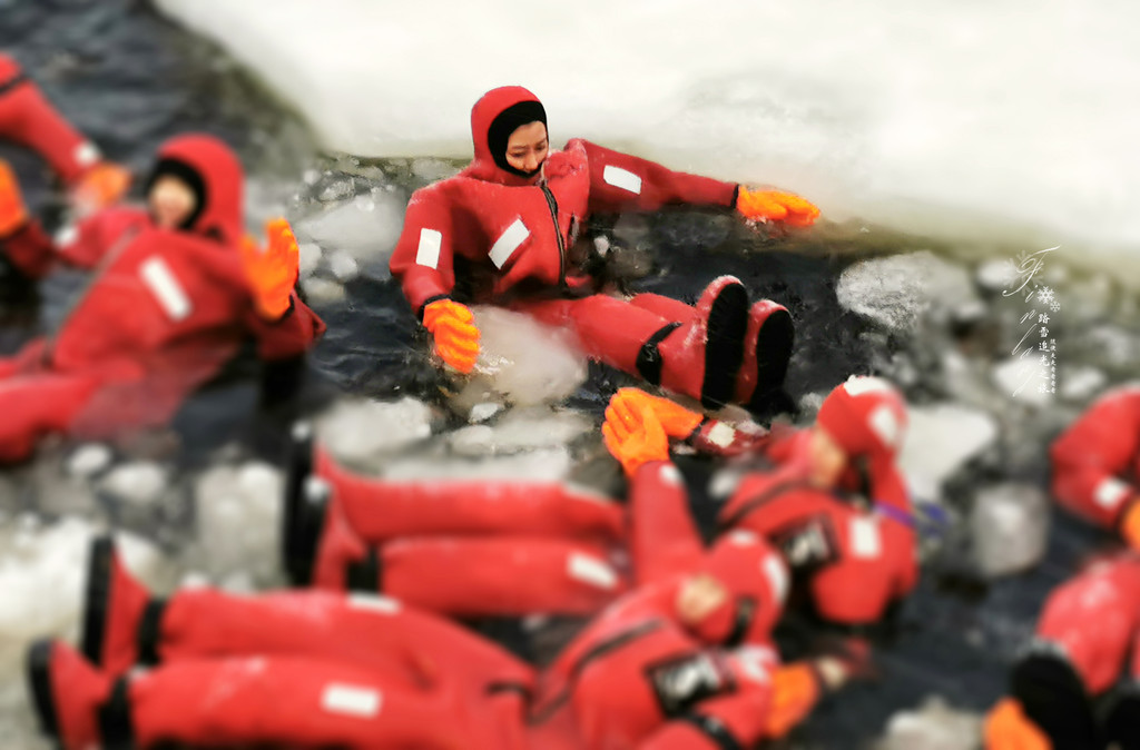 到了下水处,先坐在边缘,然后工作人员会推你下去。作为一个旱鸭子,竟然可以稳稳地浮在冰面上,甚是欣喜。为了防止水从脖子处进入,基本保持着半坐半躺的姿势。