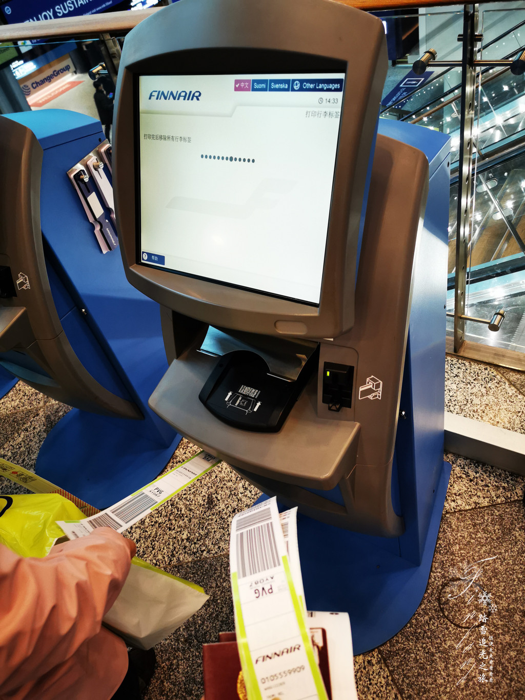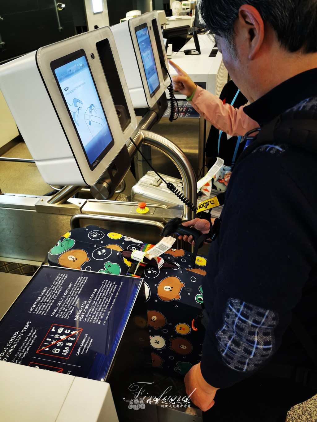 去酒店拿了寄存的行李后前往机场。第一次碰到全自助,进门口就有许多自助打印行李标签的机器(登机牌可能也在这里,我们已提前拿到登机牌),之后将行李标签按照要求贴在行李把手上,然后自助托运行李。