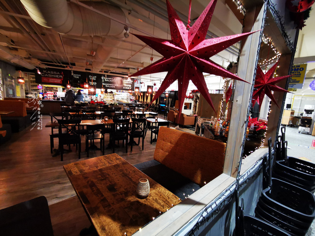 在去机场前就近找了家餐厅解决我们芬兰行的最后一餐,VLTAVA位于火车站对面的一栋独立小楼里,1-2楼类似酒吧简餐的地方,3楼用餐区,比较有意思的是挑空的地方还有个轨道小火车景观。