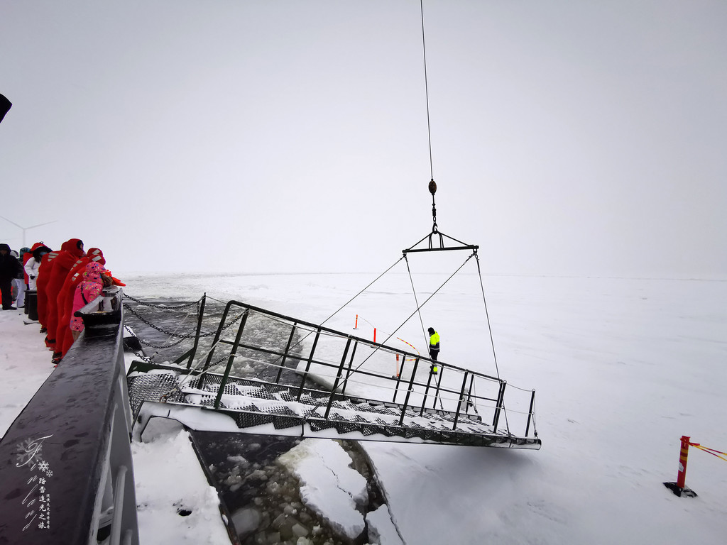 第一批“小龙虾”准备就绪,工作人员放下铁桥,将安全区域围起来,再推开一些大块浮冰,接着就推着“小龙虾”们下海~