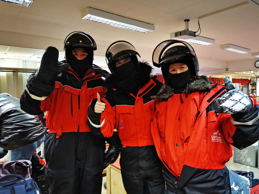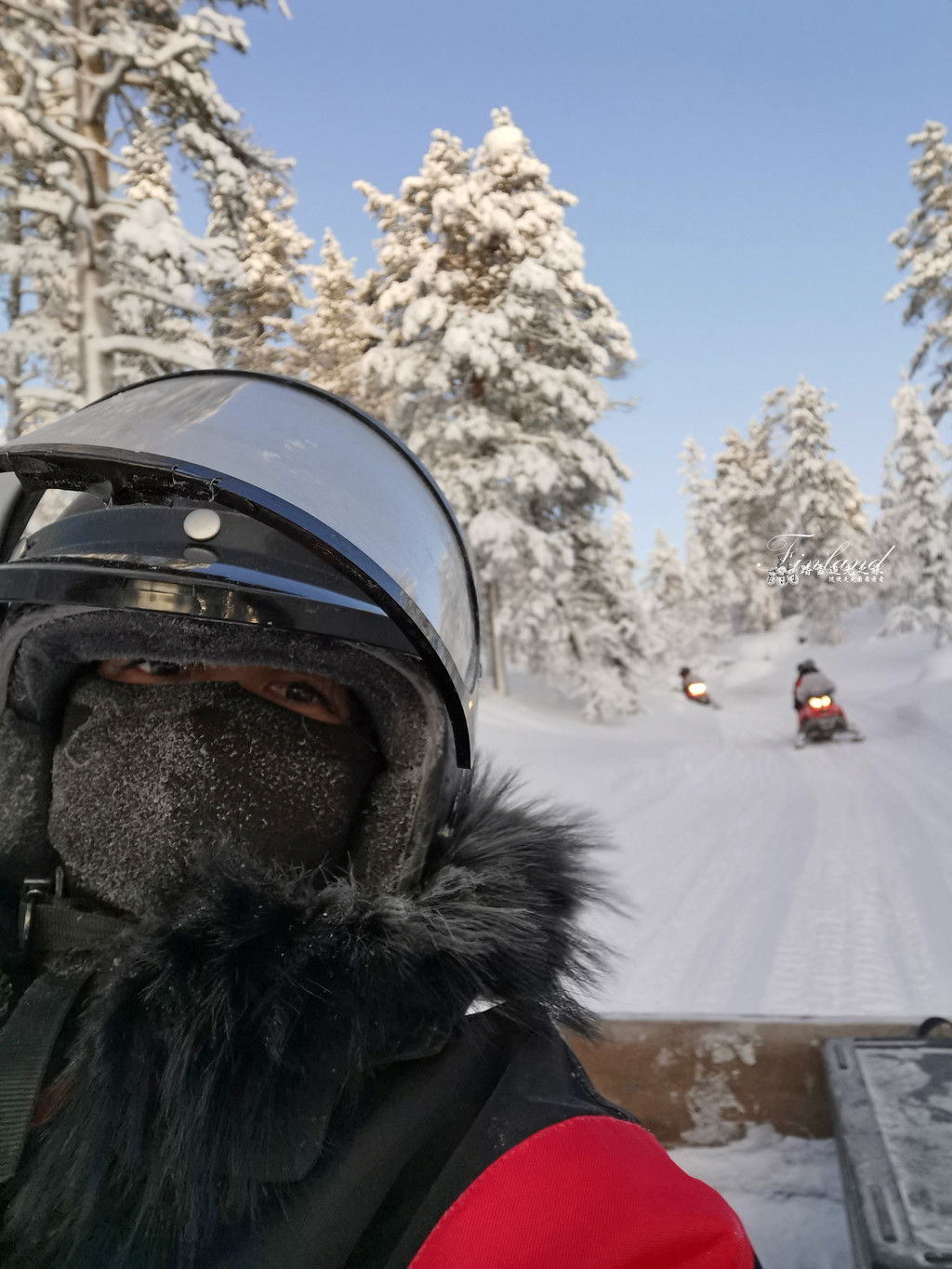 雪地摩托两人一辆,开车的人需要有驾照,虽然我们驾照和翻译件都带了,但是也没被要求检查,这里一切靠自觉!然后小哥拿出个本子上面有些内容,也就是一些规则比如需要有驾照才能驾驶巴拉巴拉之类的,最主要是最后有一页写着如果出现事故车辆损坏是需要赔偿的,隐约记得挺贵好像几百欧,然后有个类似保险的项目,15欧一辆车,万一有损坏可以以较便宜的价格来赔。其实我觉得看个人,当然一般不会出现那么大的事故,但是我们谁也没玩过啊,不知道啥情况就买个安心吧。之后小哥根据我们的身材提供统一的衣服、袜子、鞋子,衣服是需要穿在自己外套的外面,因此全部穿完还是挺累人的~ 之后是面罩,有洁癖的朋友可以自行准备,然后是头盔,和手套,建议在手套里再带一副厚款的滑雪手套~ 全部穿完基本也就分不清谁是谁了~