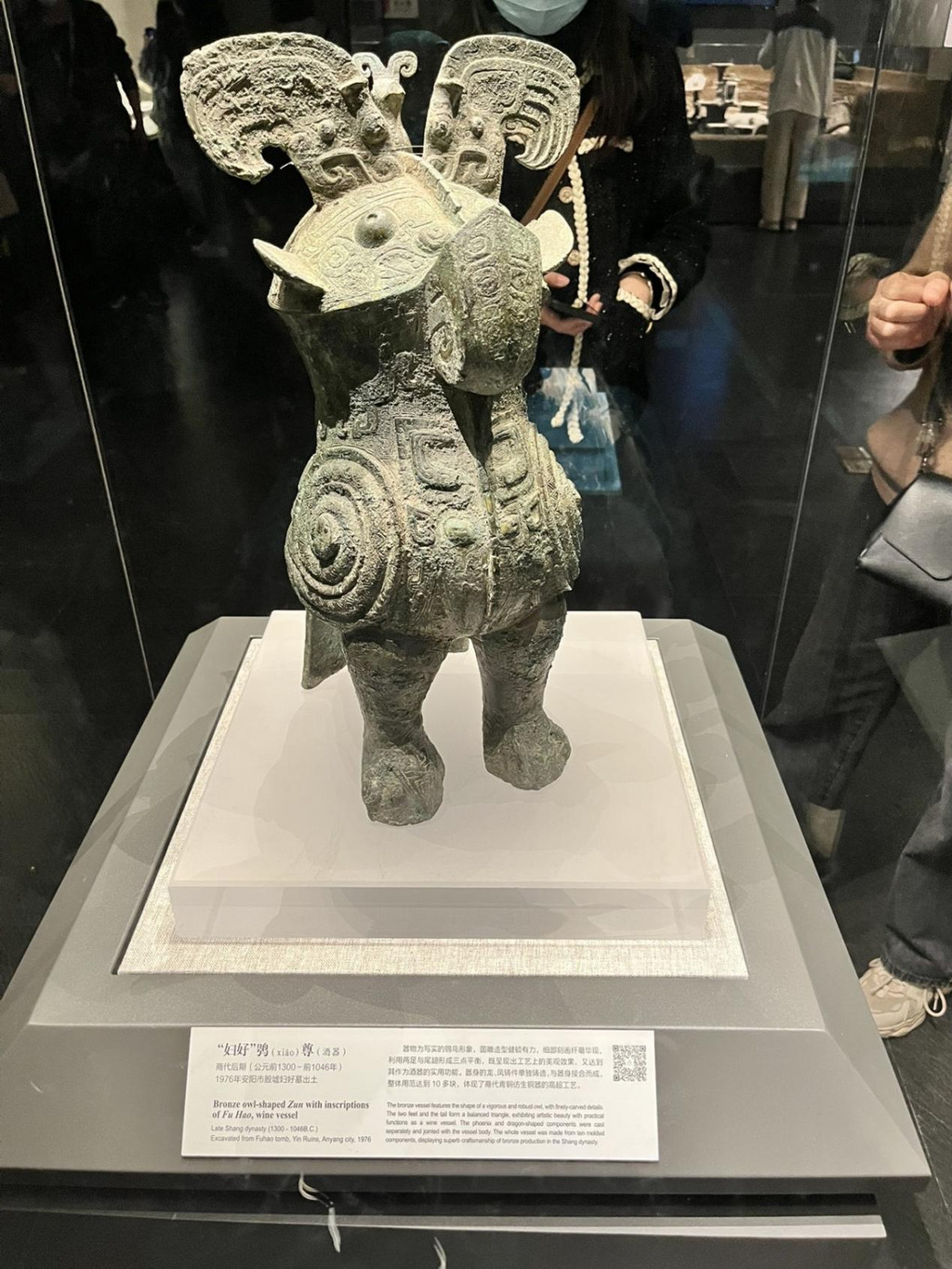 博物馆很大。参观下来大概是要2个多小时吧。大家注意把握时间。镇馆之宝有9个,这9个都是在不同展厅里。如果想要看每一个镇馆之宝,确实需要时间。令我记忆深刻的就是妇好鸮尊。这就是一个猫头鹰,而且是活灵活现的感觉。其实是做成了一种酒杯的形式。好多人对着他拍照。