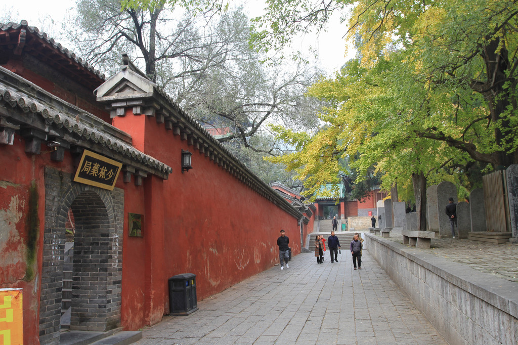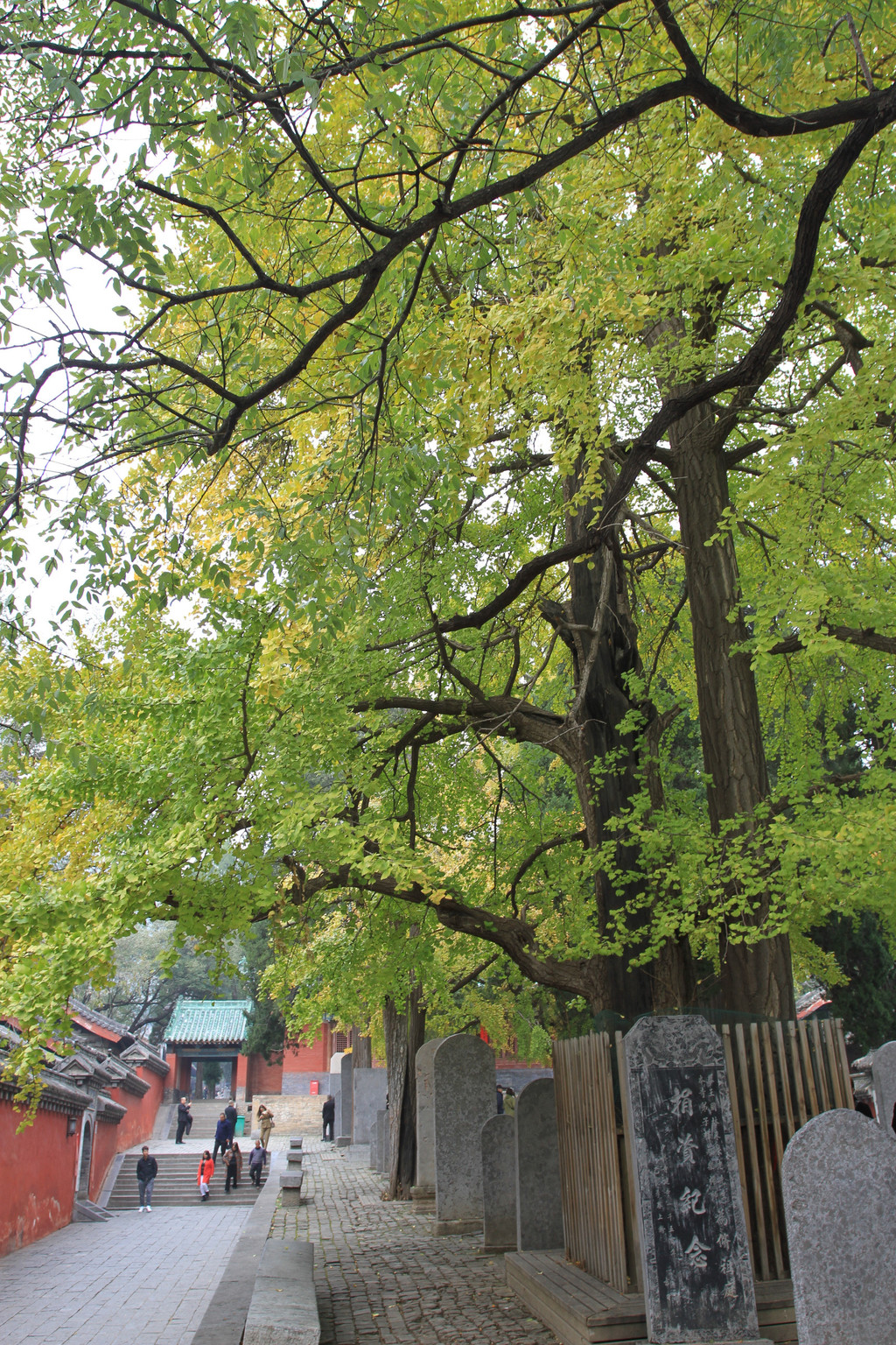 山门前甬道旁,古木参天,有的树龄已经1500年。银杏树叶大部分已变黄,让少林寺秋色更添靓丽。