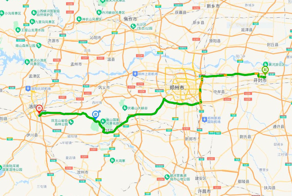 开封到郑州约70公里,开封到洛阳约200来公里,途中在少林寺(图中蓝色圈)停留参观,基本顺路。对于自驾游旅行,200来公里属于长短合适的距离,边玩边走,轻松惬意。