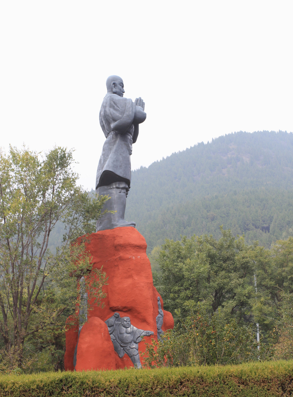 一座高大的僧人塑像,双手合十,迎接着八方来客。