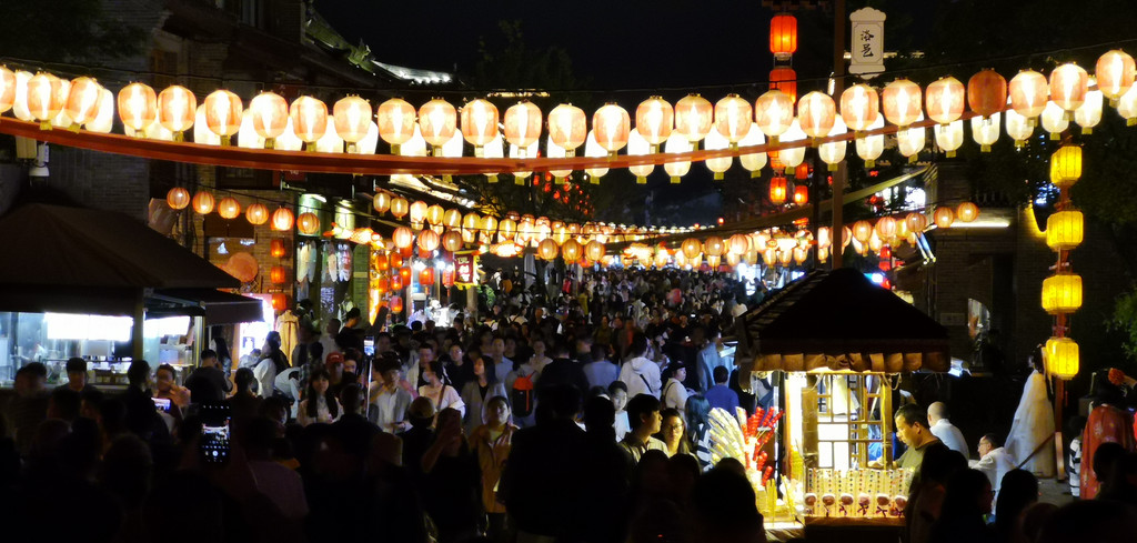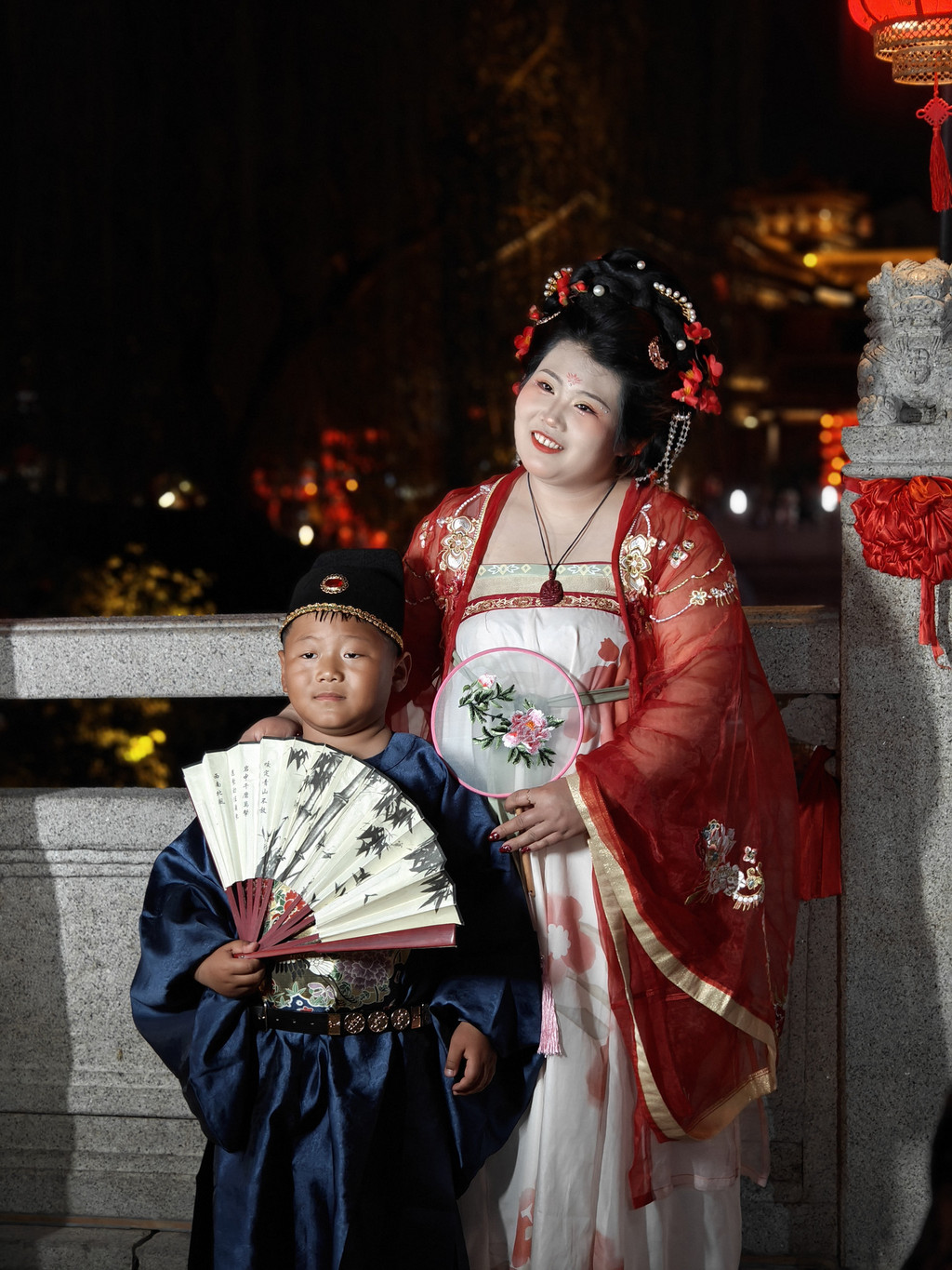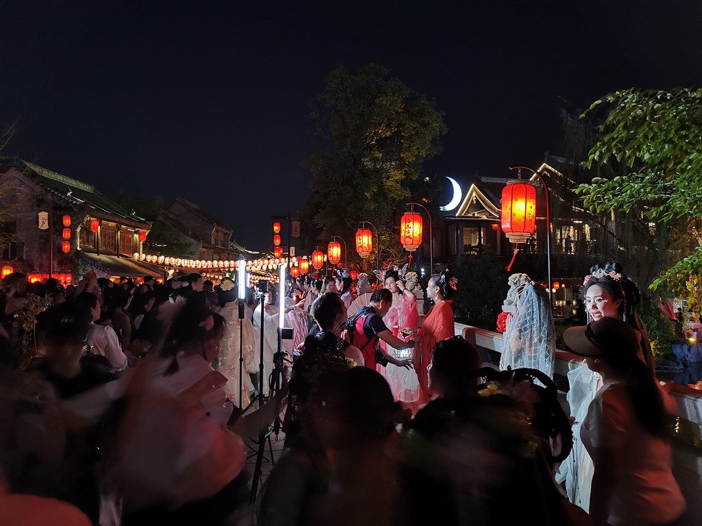 再往前走,其中的一条桥上,每个灯笼下都有几个拍汉服的在排队,景区里也游走着很多招揽旅拍生意的人,这氛围烘托得可以呀,感觉不拍上几张都不好意思说来过洛阳。