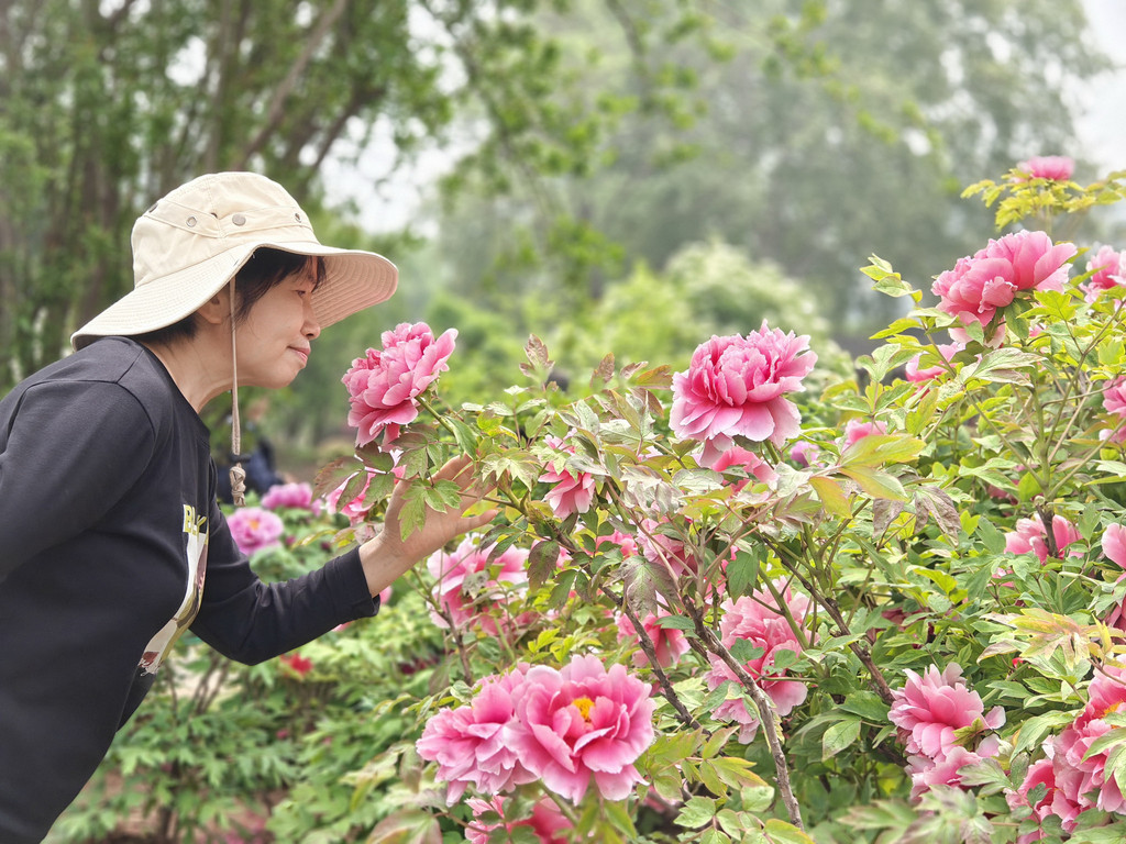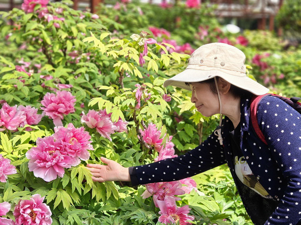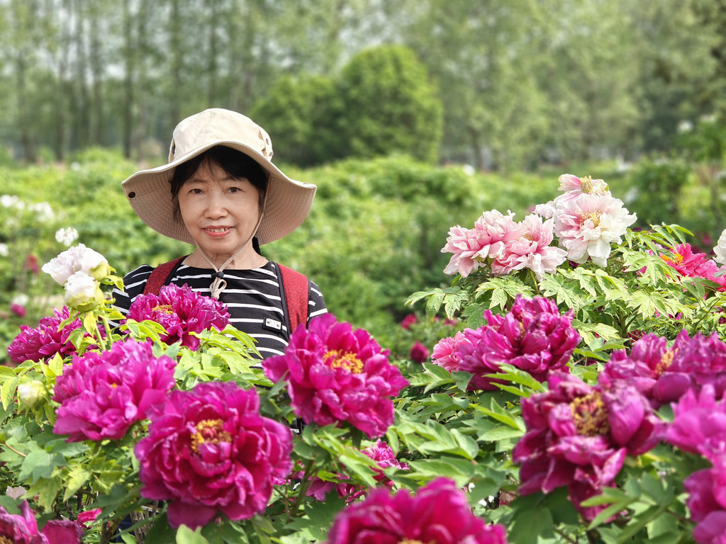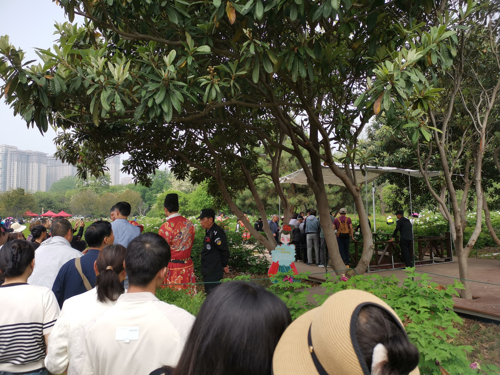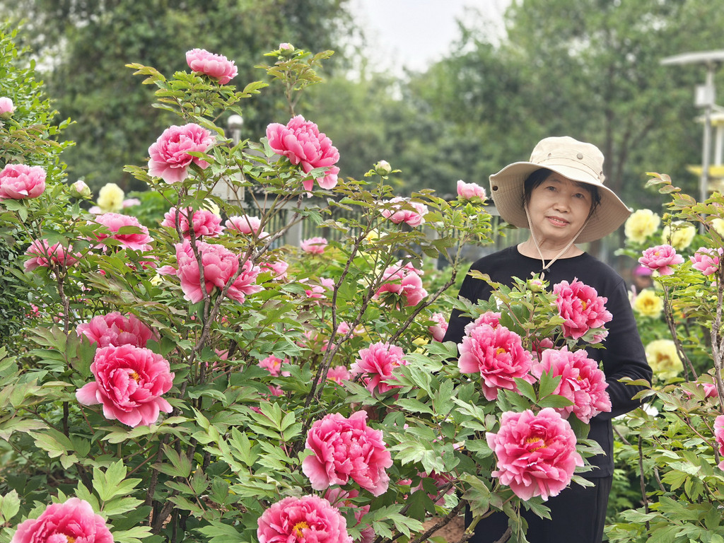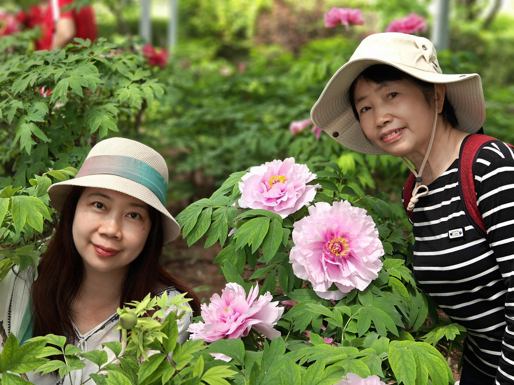 为数不多的合照,因为要近距离跟牡丹合照,要具备好多条件,其中之一是要躲进保安的视线盲区,大部分情况是要一个个轮着来拍