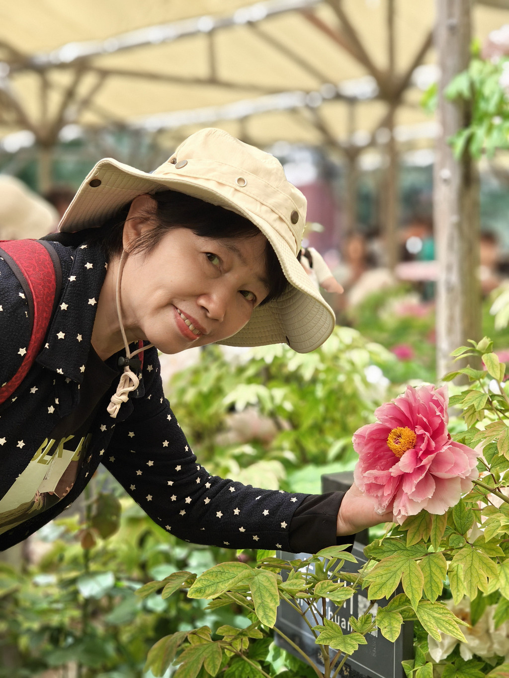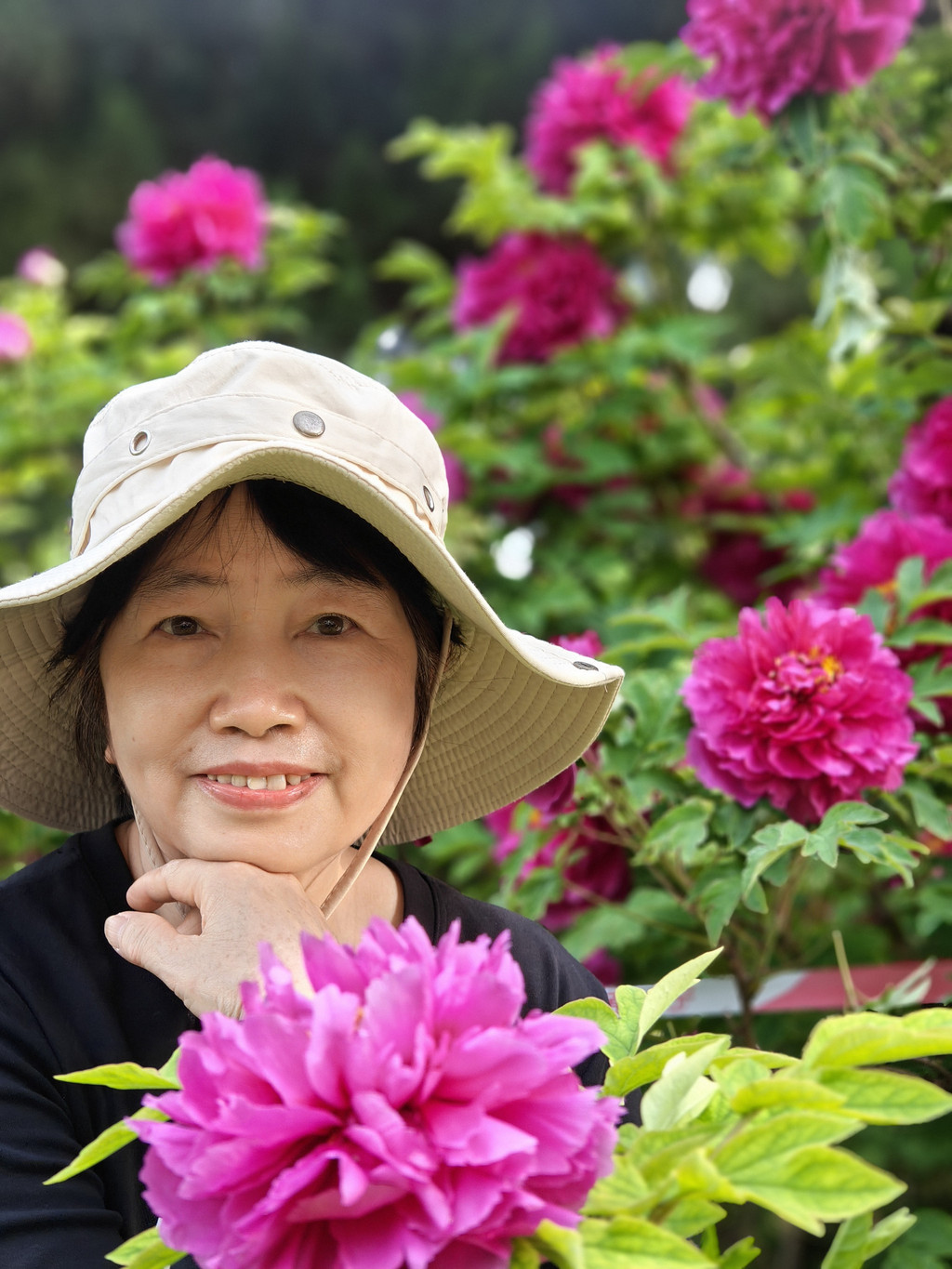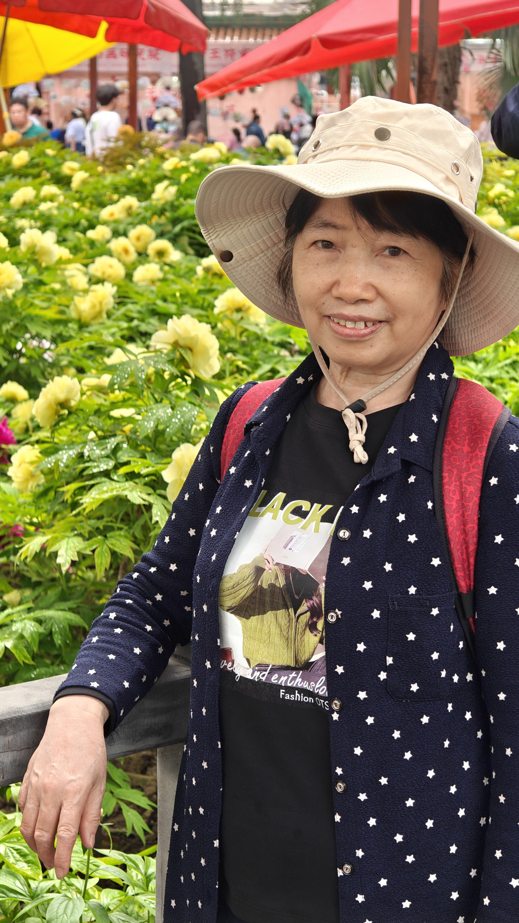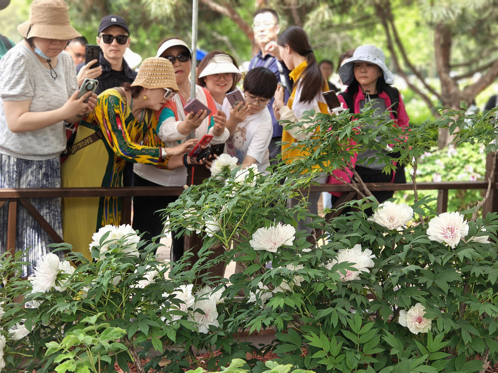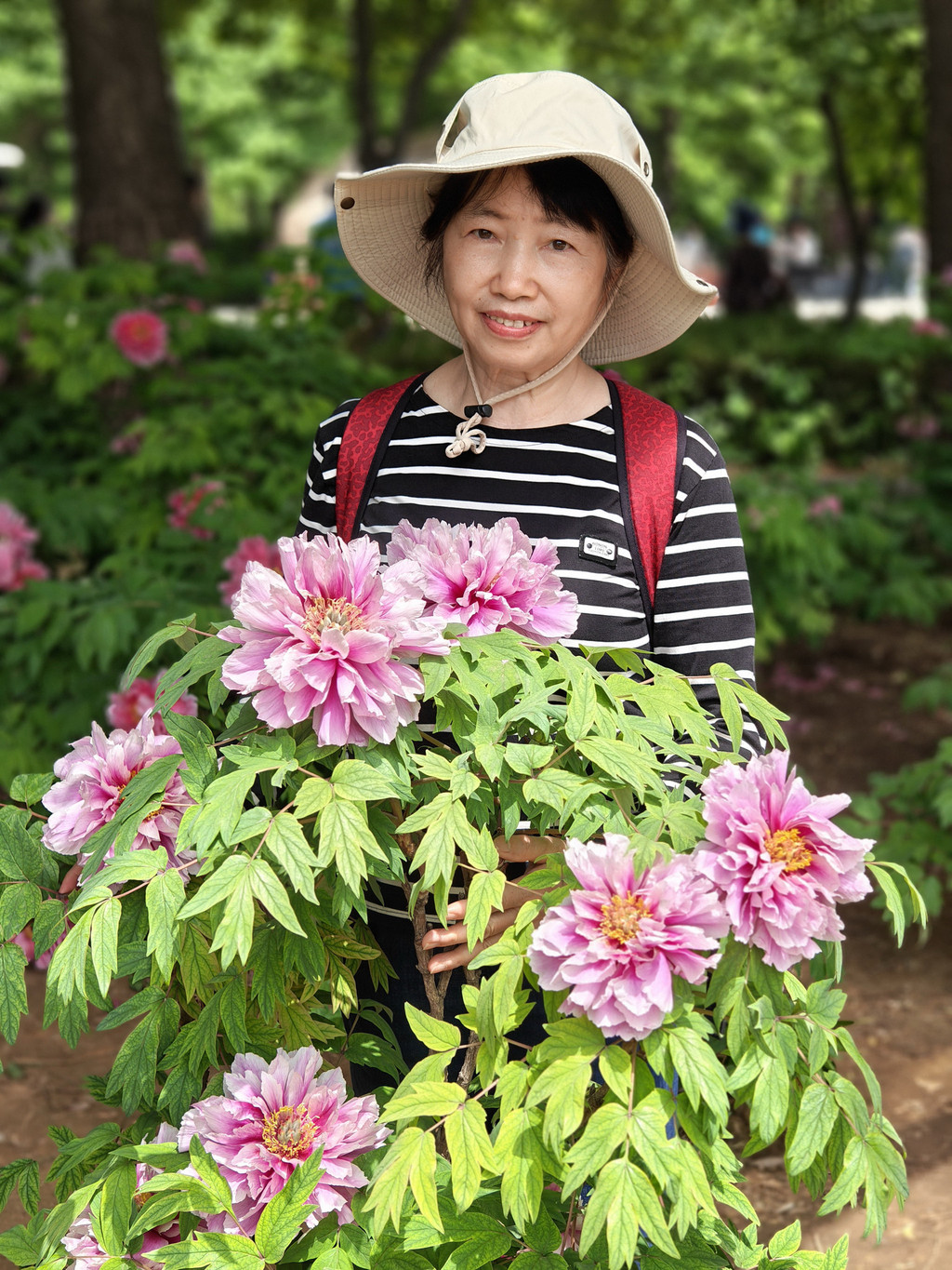 为数不多的合照,因为要近距离跟牡丹合照,要具备好多条件,其中之一是要躲进保安的视线盲区,大部分情况是要一个个轮着来拍