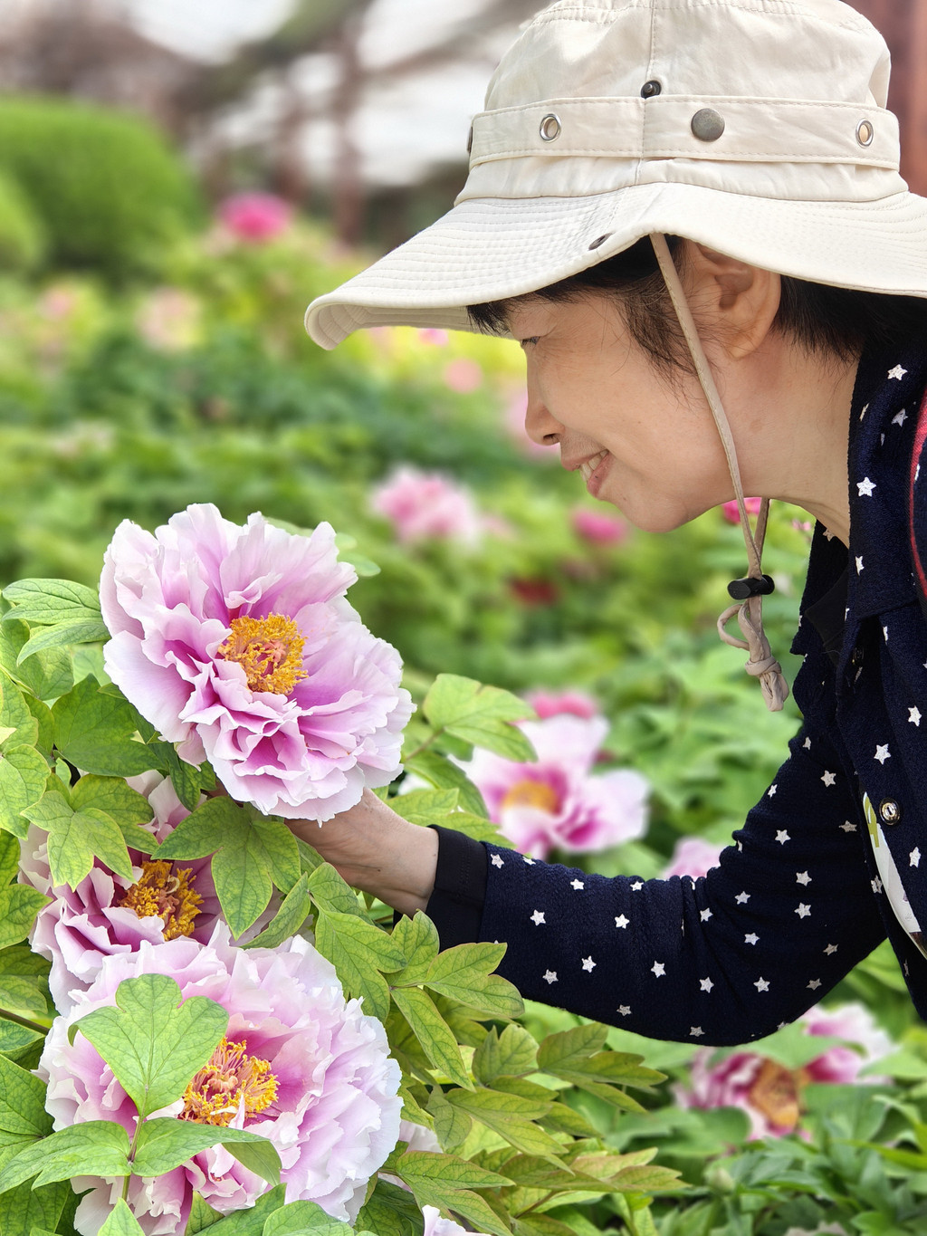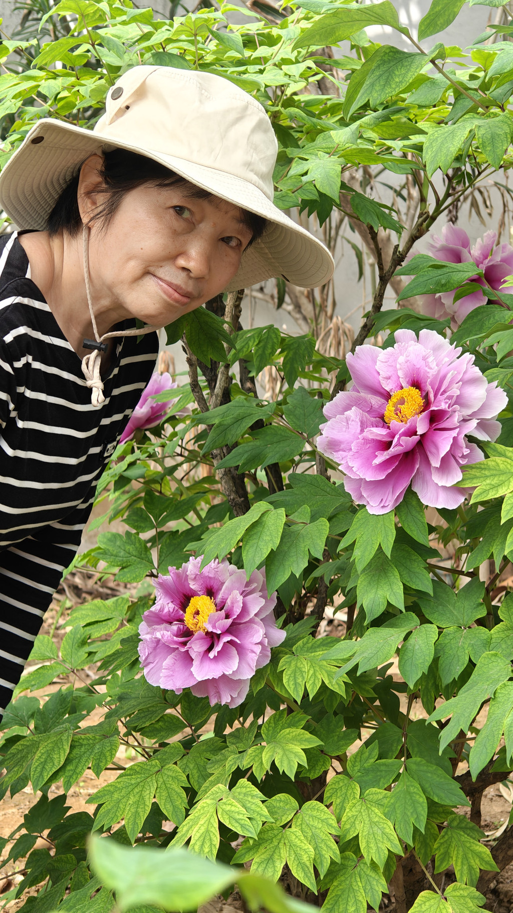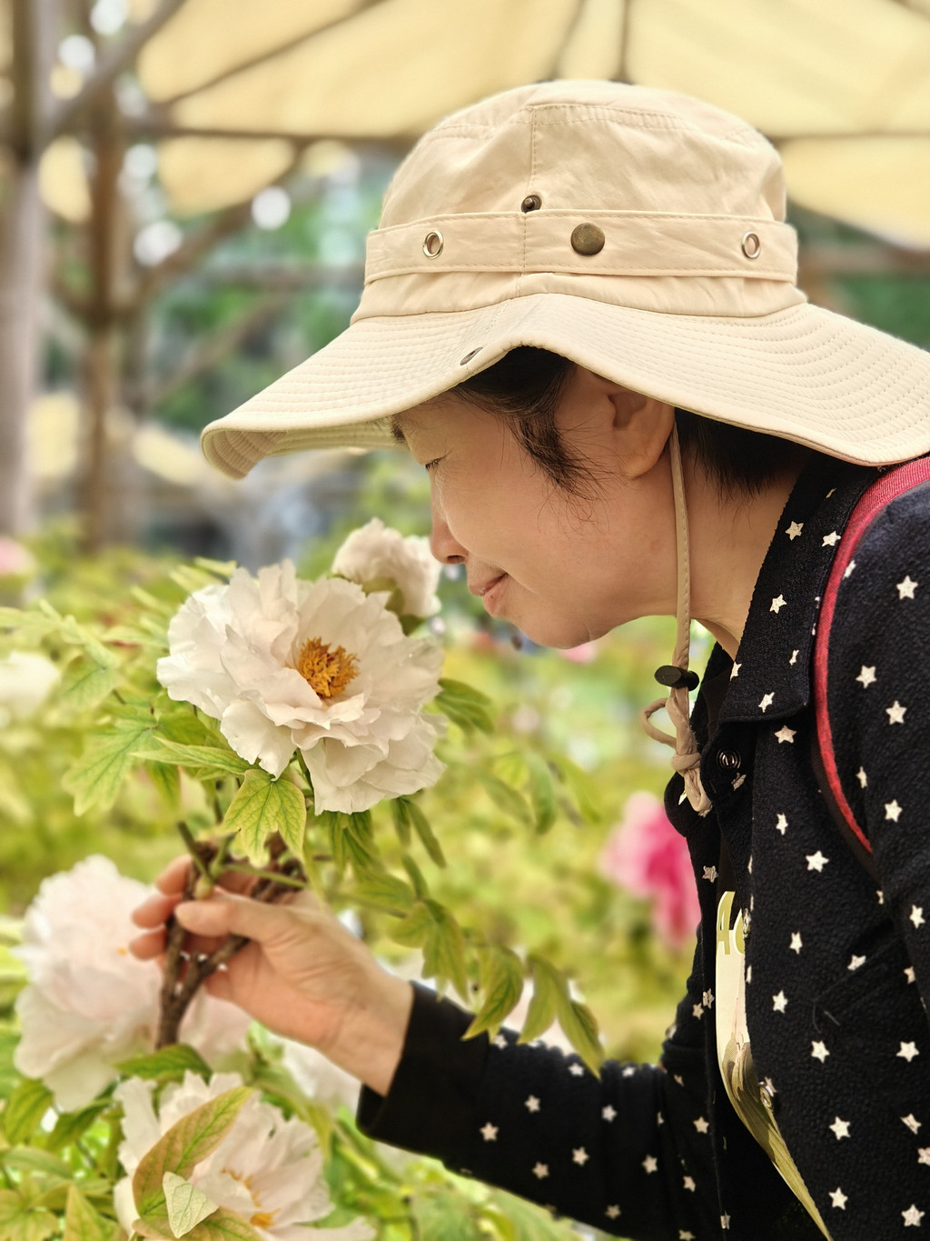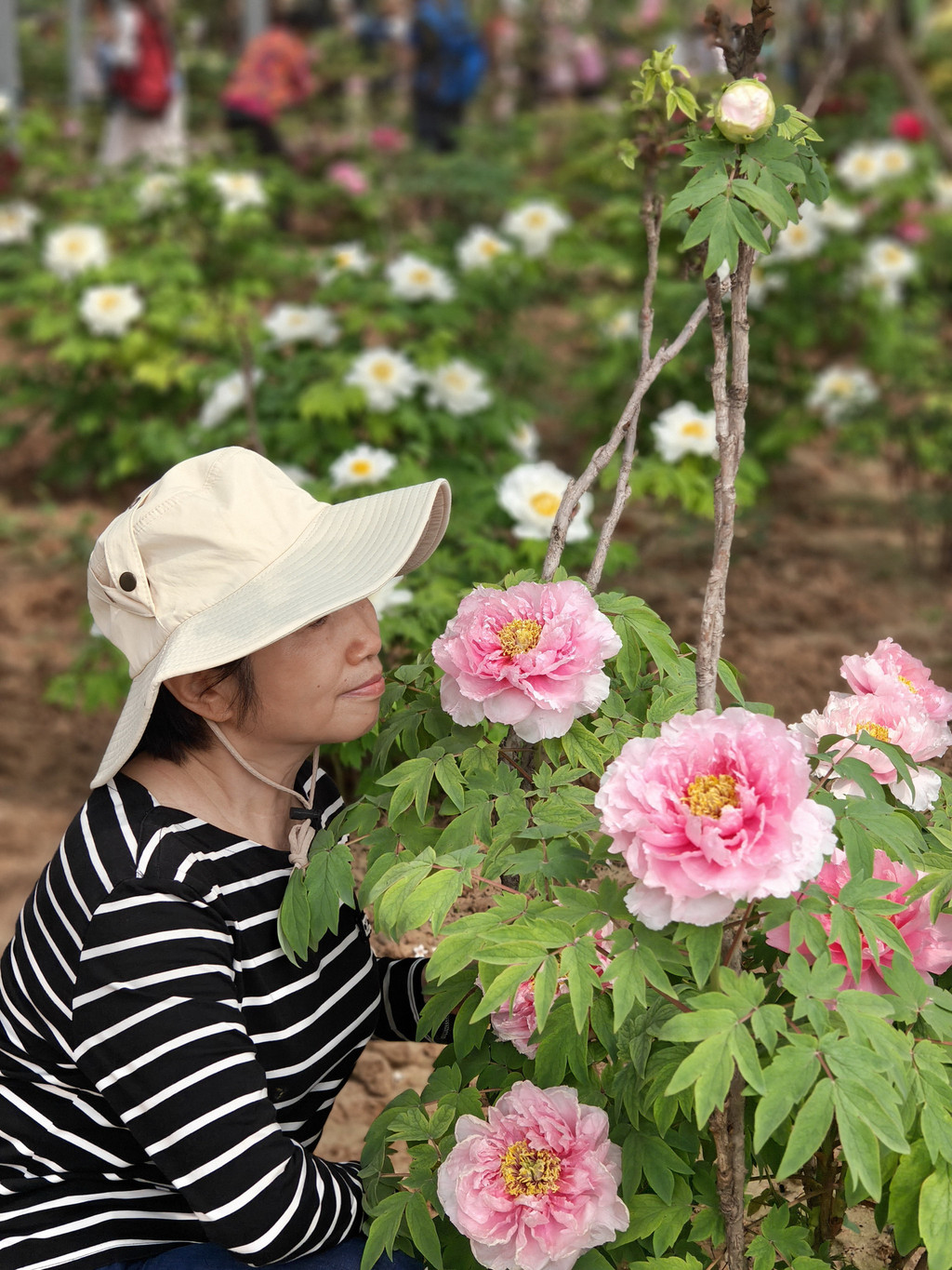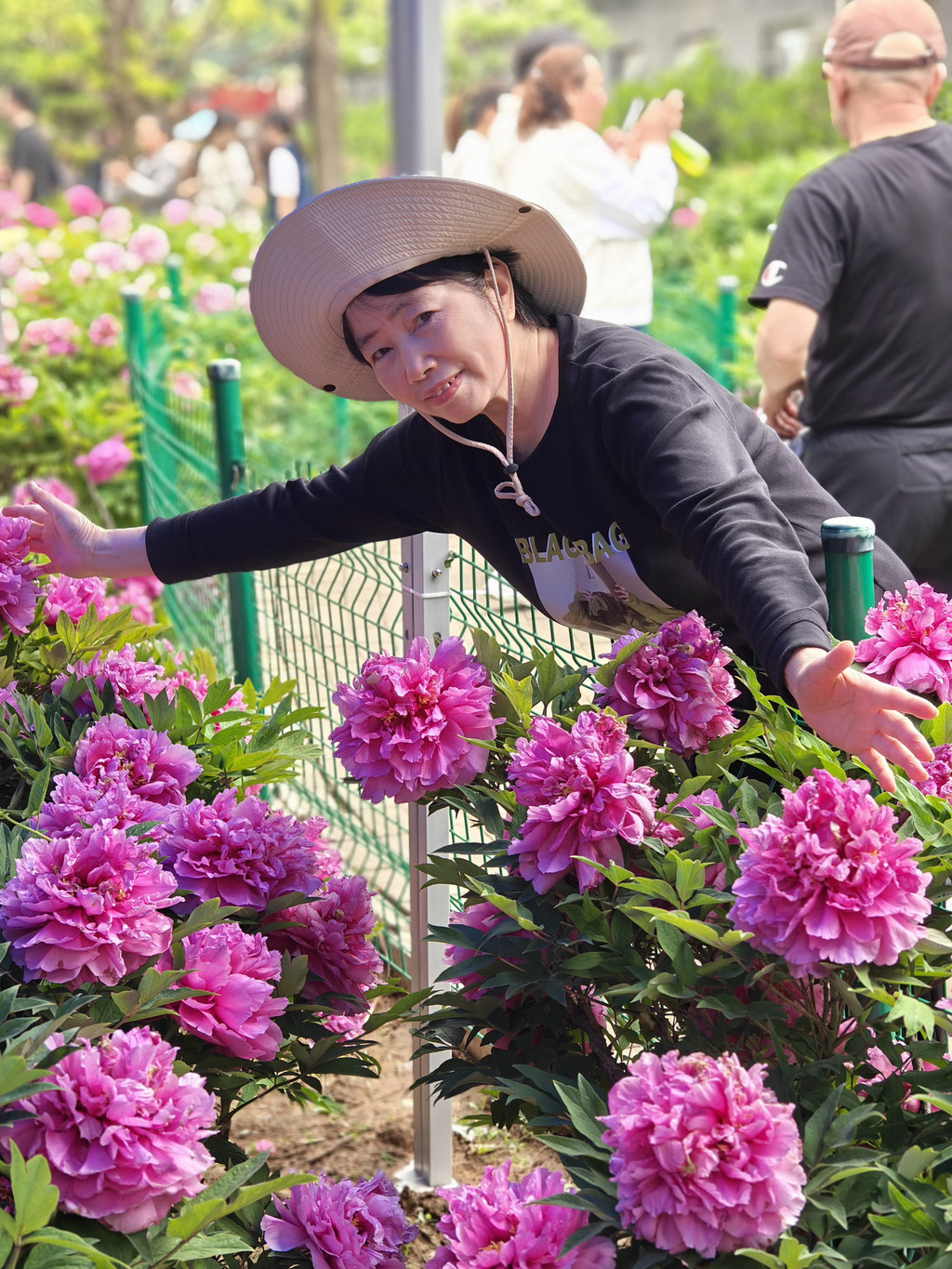 为数不多的合照,因为要近距离跟牡丹合照,要具备好多条件,其中之一是要躲进保安的视线盲区,大部分情况是要一个个轮着来拍