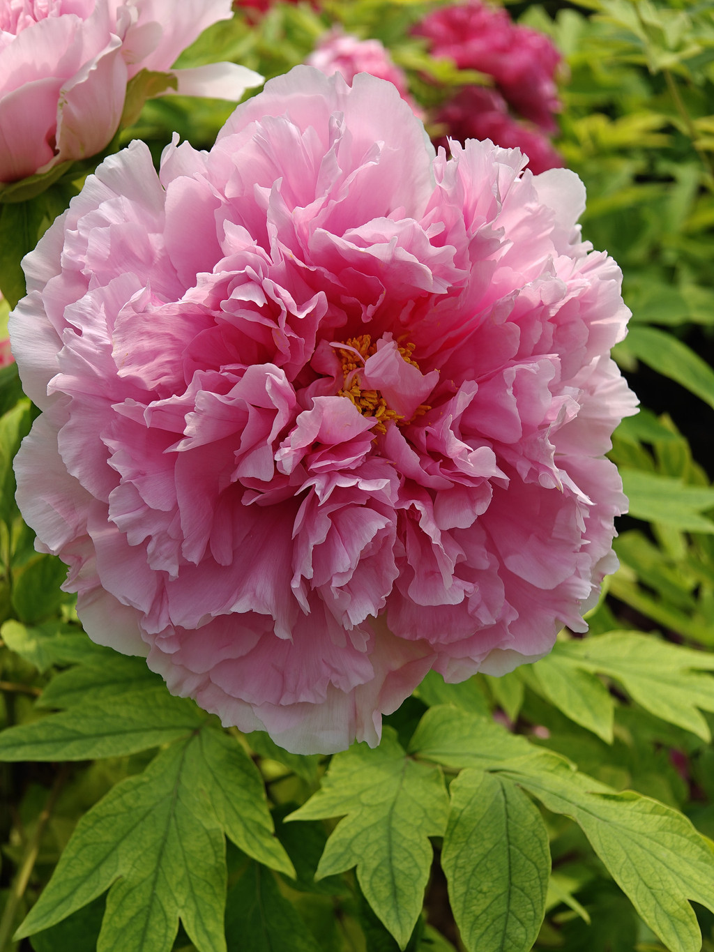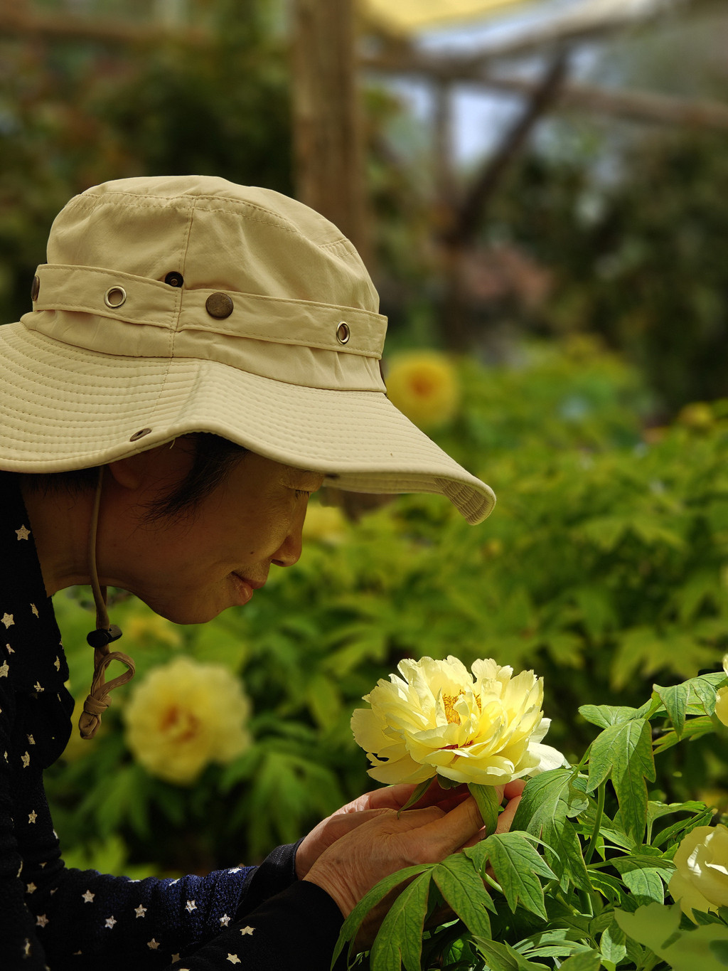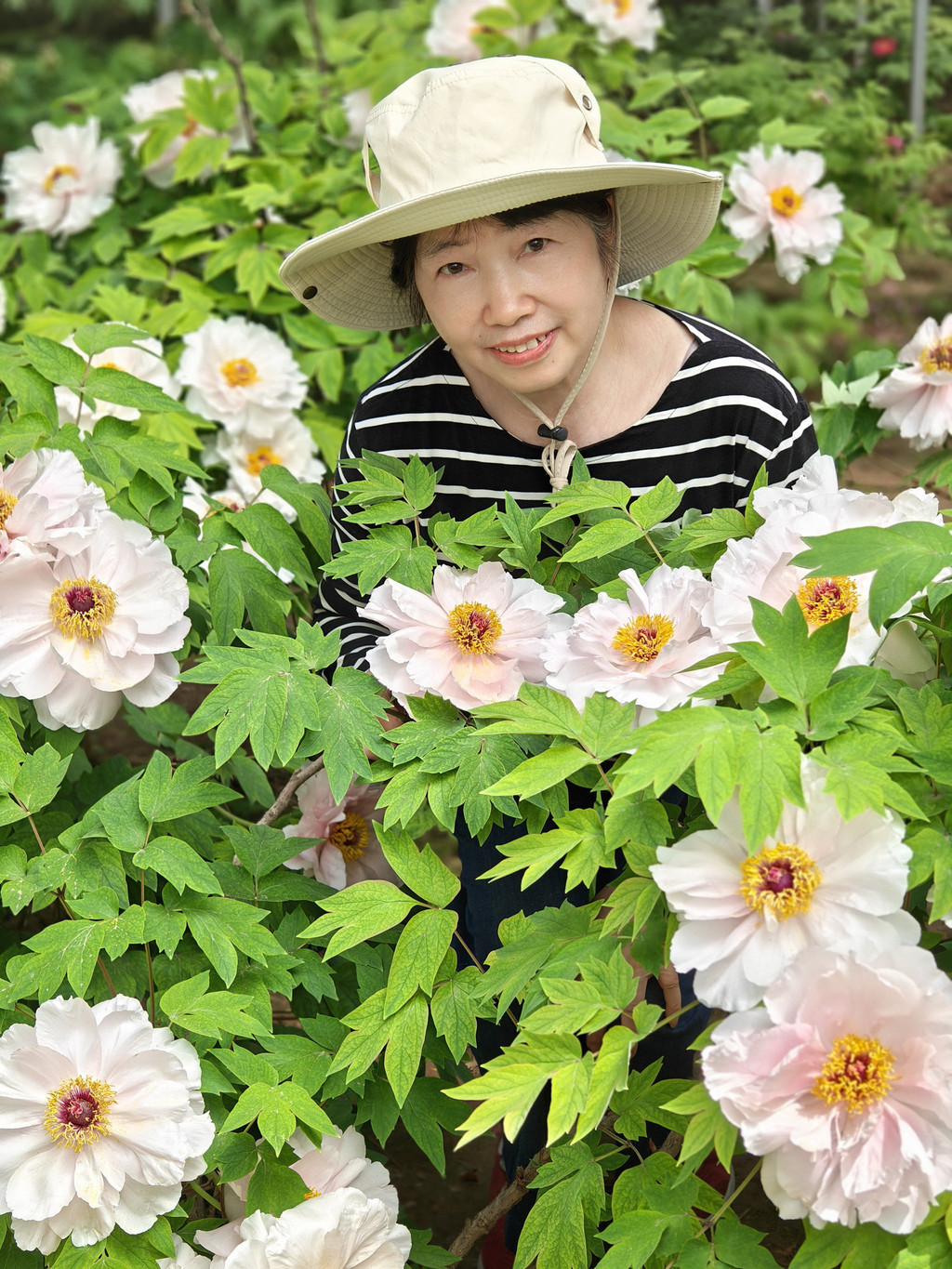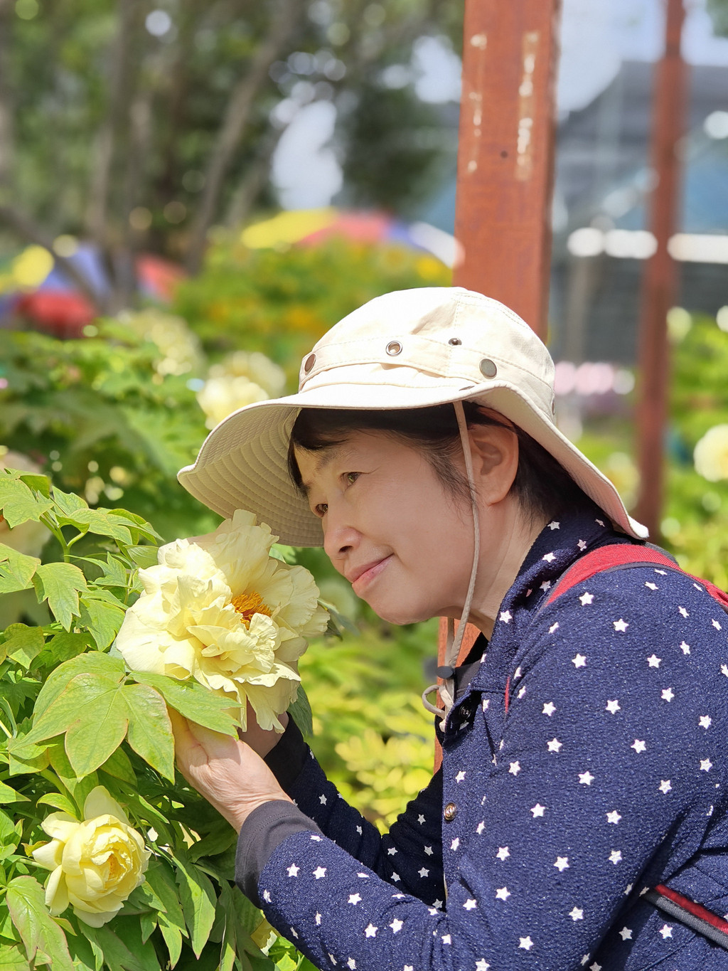 为数不多的合照,因为要近距离跟牡丹合照,要具备好多条件,其中之一是要躲进保安的视线盲区,大部分情况是要一个个轮着来拍