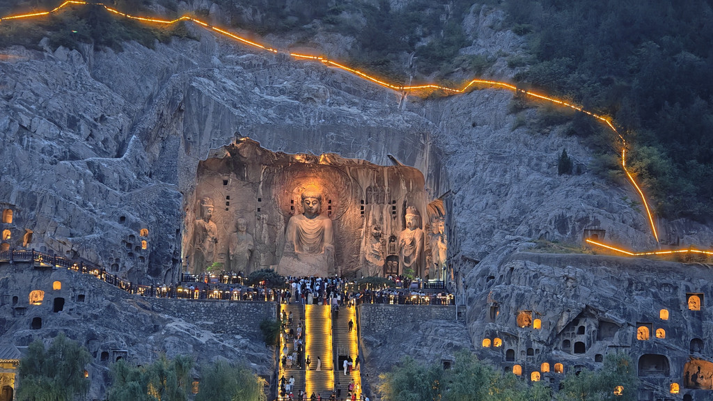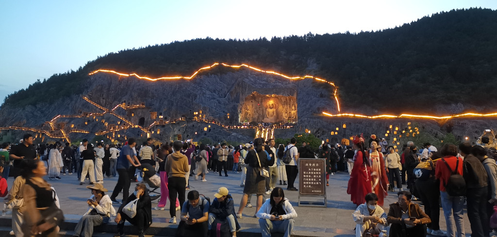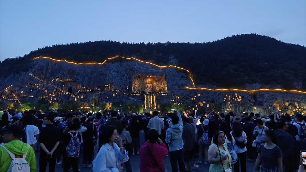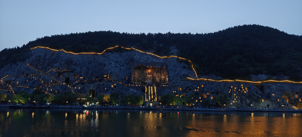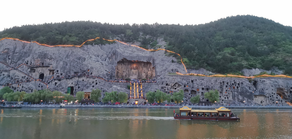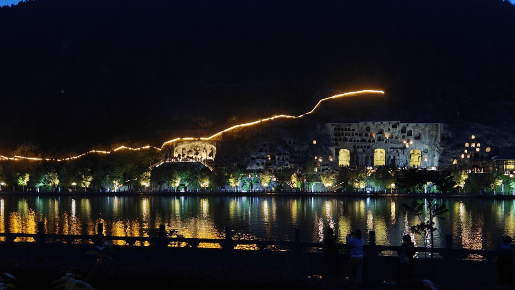 龙门夜景,是另外的艺术创作吧,从石窟里亮灯是渐进式的,大佛的灯也是逐渐亮起来