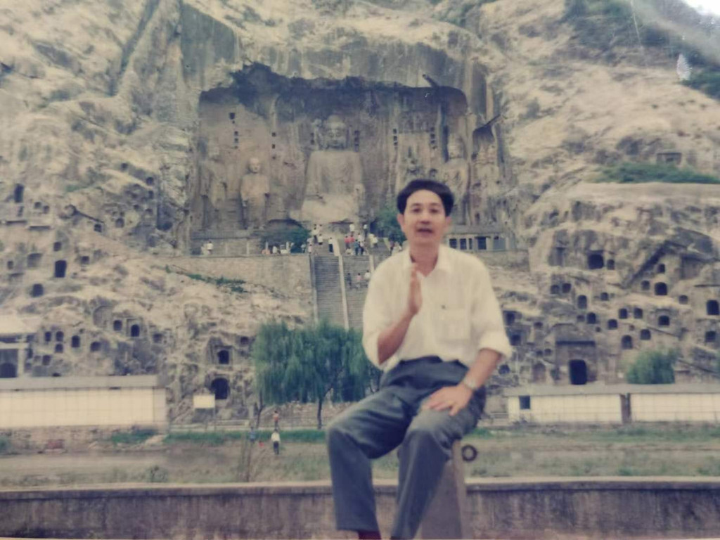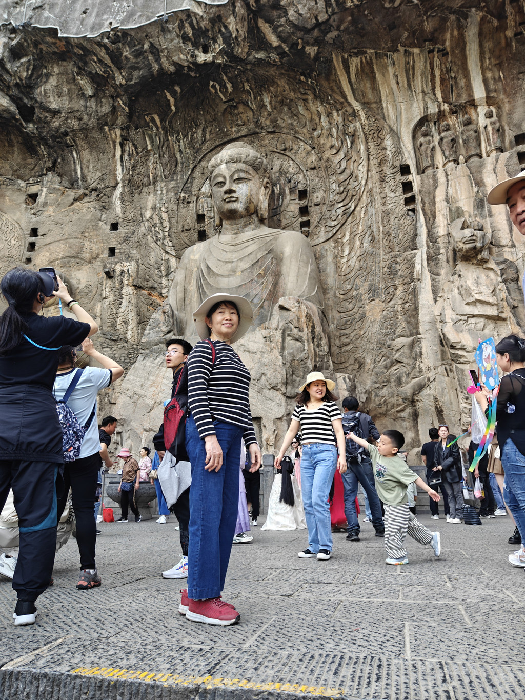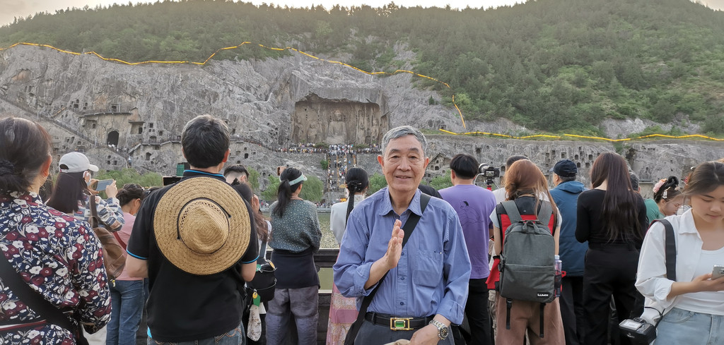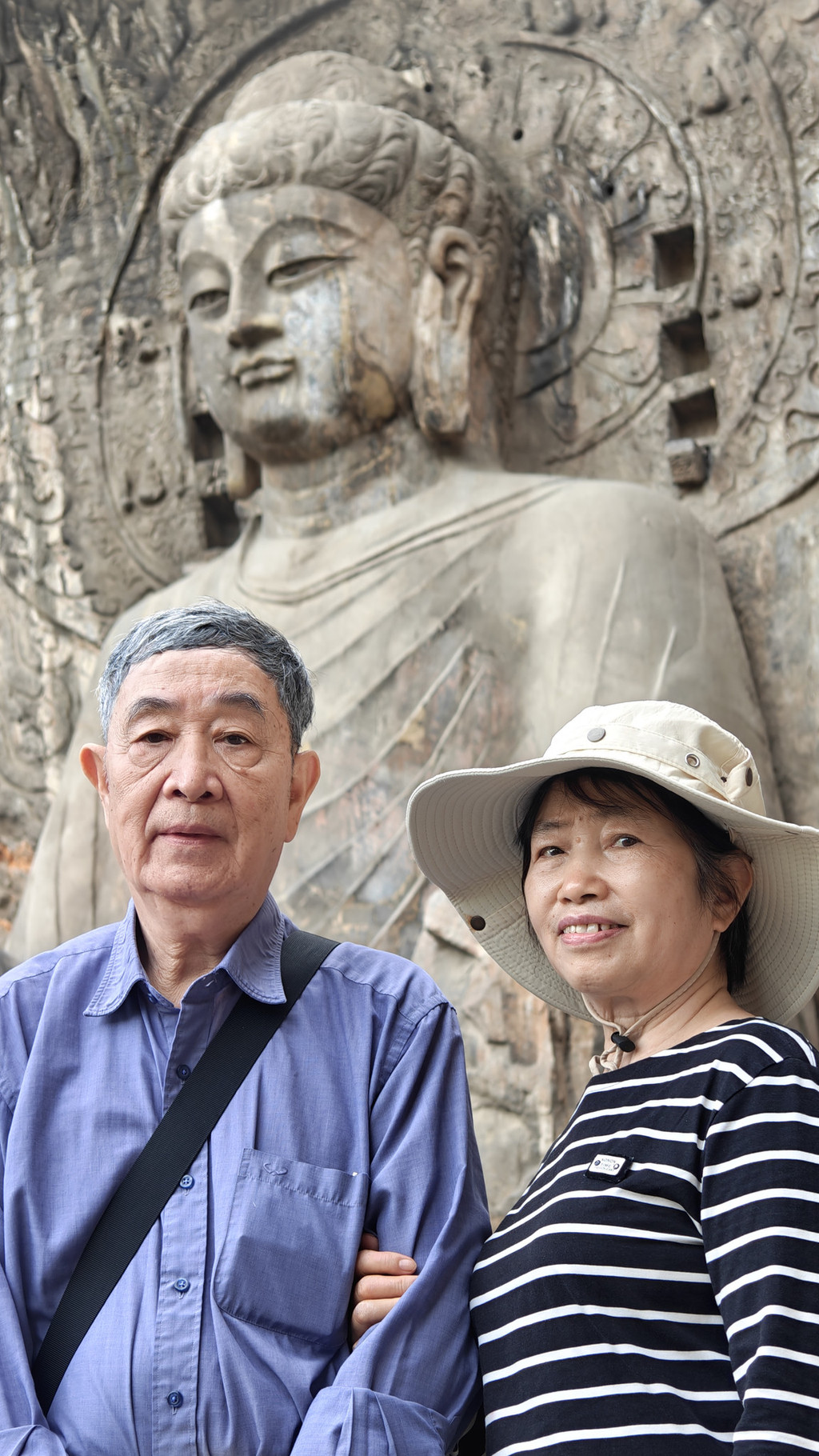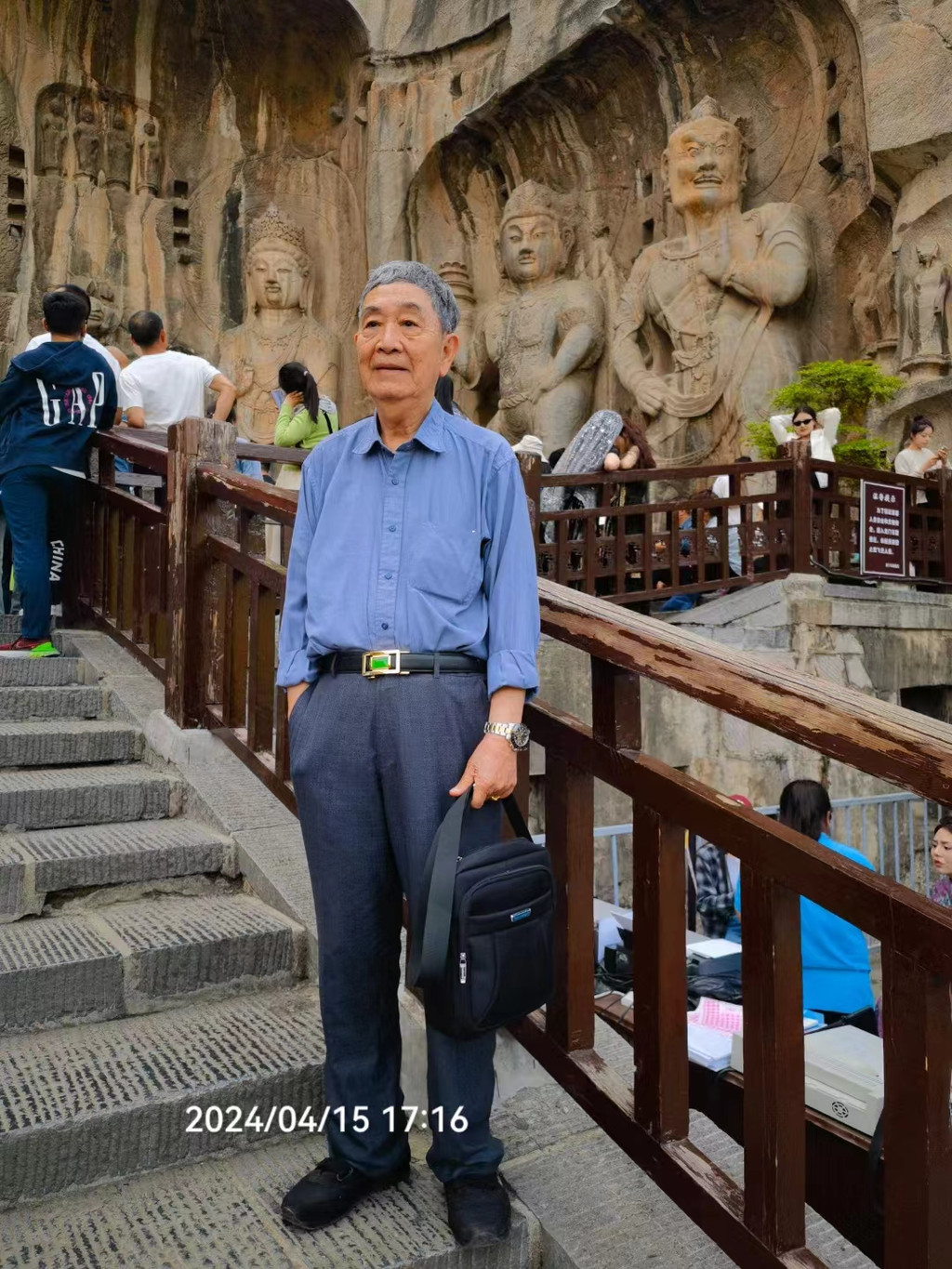 老爸站在同一个位置留影,两旁人潮涌动,佛陀一笑注目千年。