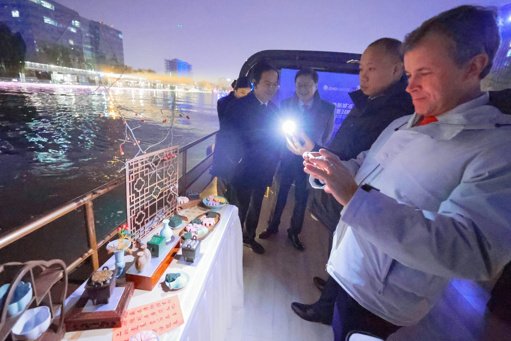 西班牙哈恩市市长胡里奥·米兰·穆诺对船上摆放的文物甜品台饶有兴趣,频频拍照:“不敢相信这些都是可以吃的食物,我要发给我的家人们,还有政府的同事们也看一看。这里的夜游经济从视觉、味觉都和本地历史文化结合得很好。”