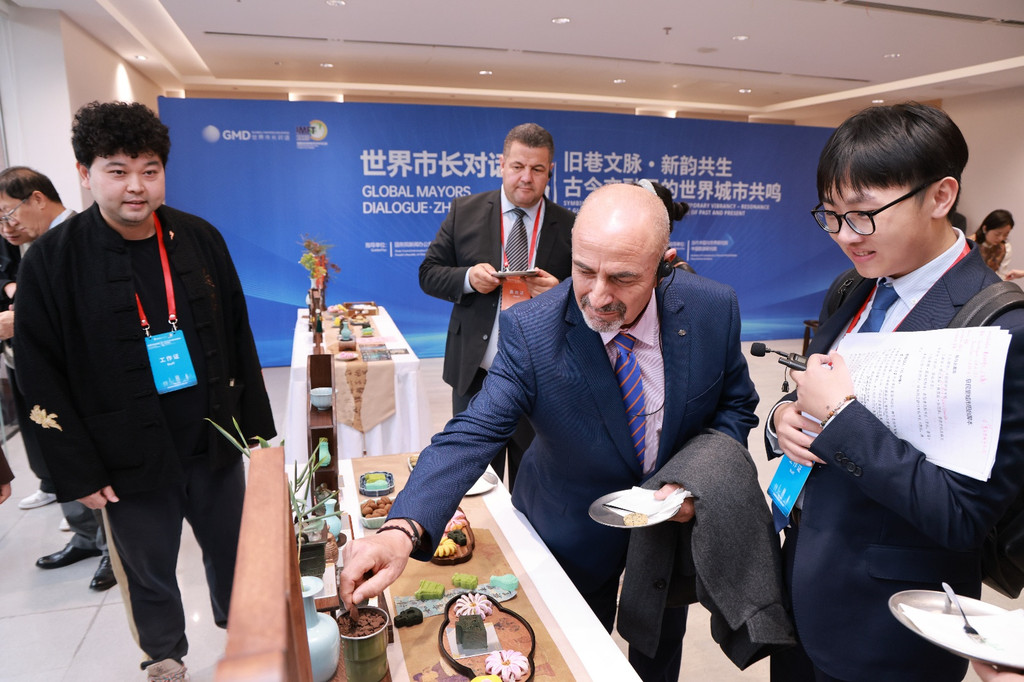 郑州副市长张艳敏向多国城市市长分享郑州城市更新、文化传承与历史保护的平衡共赢经验。在茶歇环节,她向国外市长们介绍道:“这些在餐桌上的文物甜品也是微型的文化展馆,是最具有河南特色郑州特色的东西方融合下午茶。”