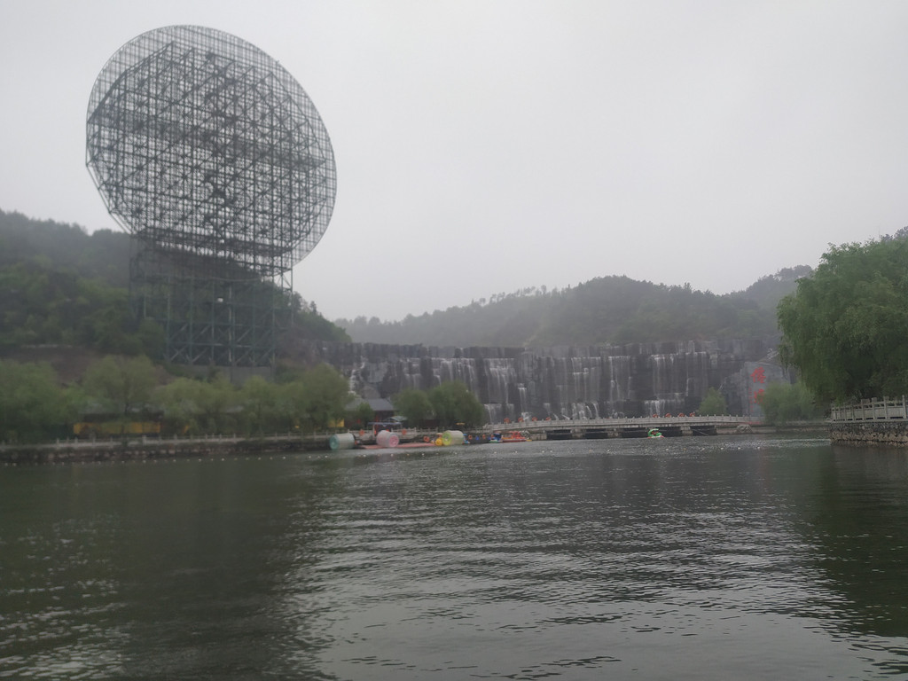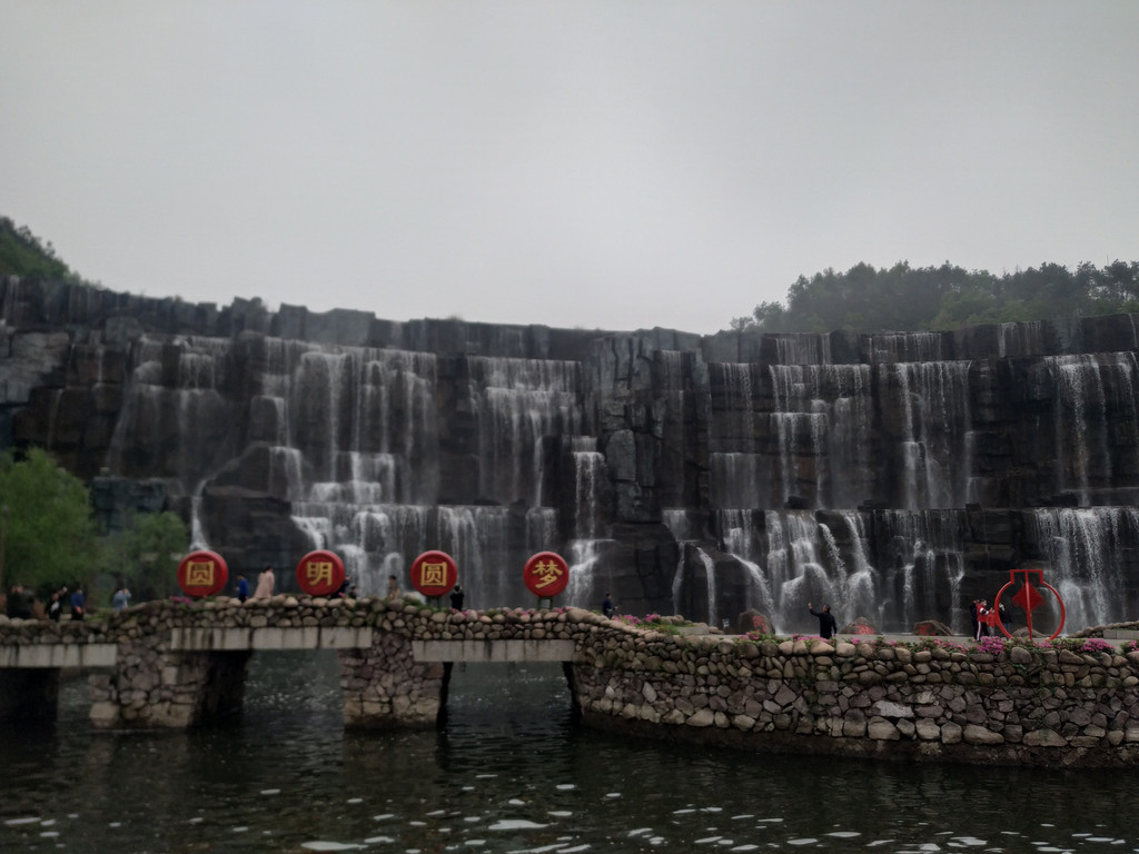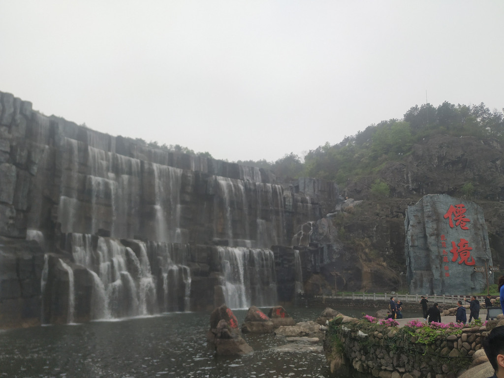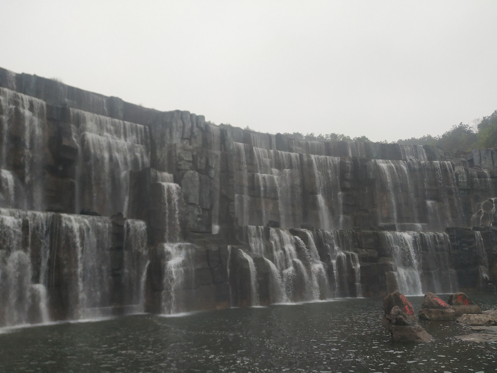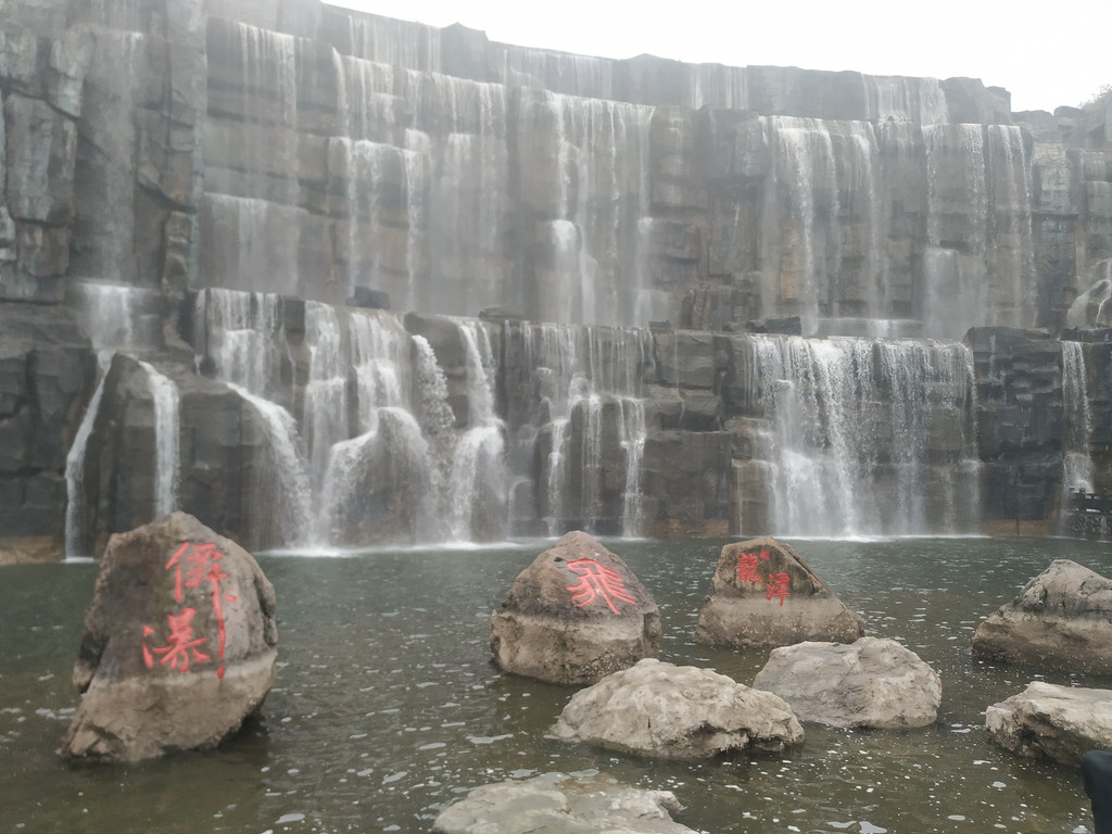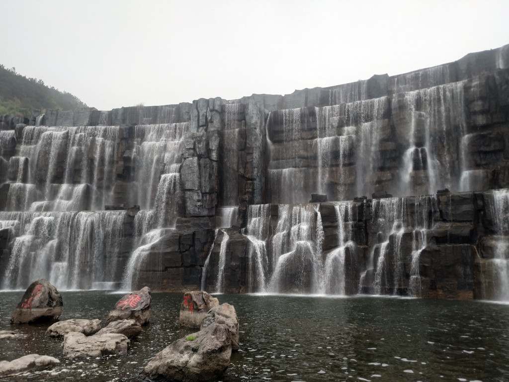 天池瀑布,瀑布高30米、宽150米,是目前国内最宽的人造瀑布;弧形的天池水倾泻而下,声音震耳欲聋,蔚为壮观。