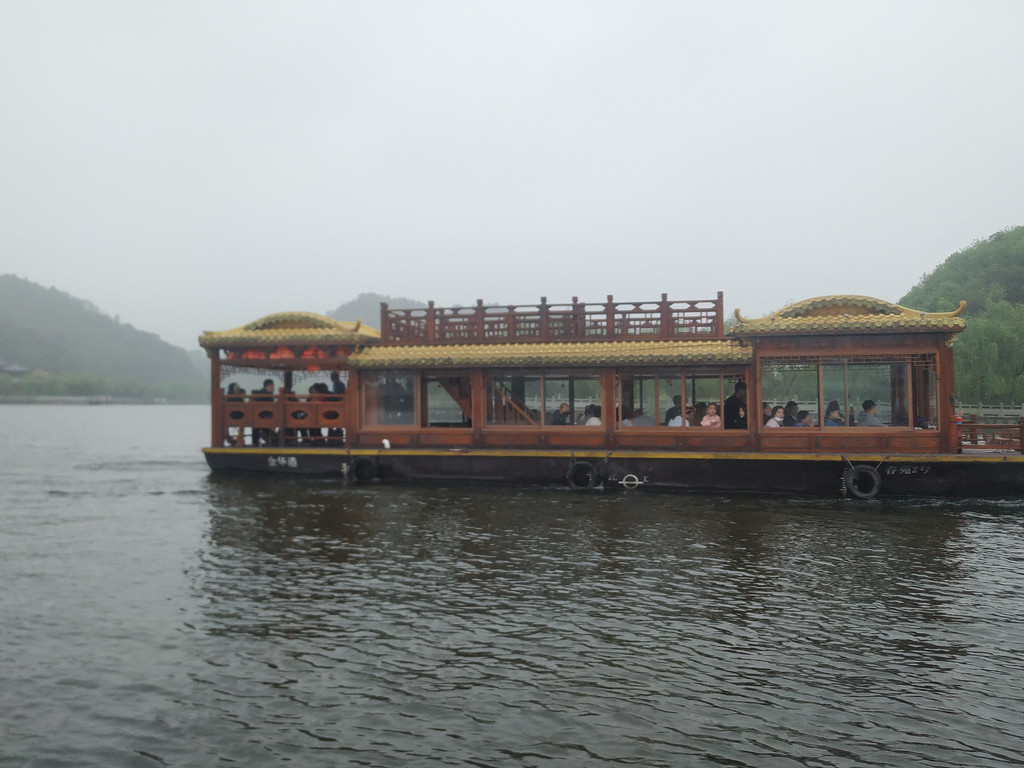 福海是圆明园内最大的湖,雍正帝把一座座仙山琼阁散落在东湖周围,并按“徐福海中求”寓意,把东湖命名为福海,期望自己长生不老,大清帝国江山永固。福海上雾气雾气腾腾,十分朦胧,而在一片片雾中,而游船上的黄颜色特别显眼。