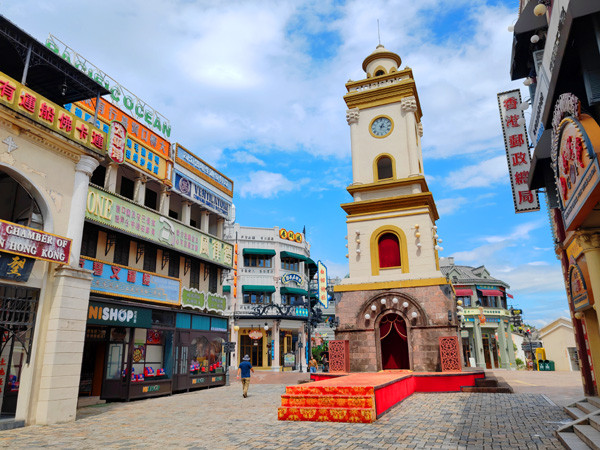 沿着街道漫步,我们来到了皇后大道。这里的建筑风格更加多样化,有欧式的教堂,也有中式的庙宇,相互映衬,别具一番风情。不远处的维多利亚港,仿制得惟妙惟肖。岸边停靠着仿古的船只,在微风的吹拂下轻轻摇曳。站在岸边,眺望着远处的风景,仿佛能听到海浪的声音,感受到那曾经繁华的港口气息。