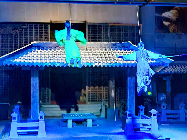《英雄比剑》是对电影《英雄》的节选片段进行现场演绎,主要展现了残剑和无名等英雄人物的比剑场景以及他们之间关于理想、信念、天下等话题的对话和交锋。演员们都具有专业的武术功底,表演真刀真枪的打斗场面,一招一式都充满力量感和节奏感,十分精彩刺激。