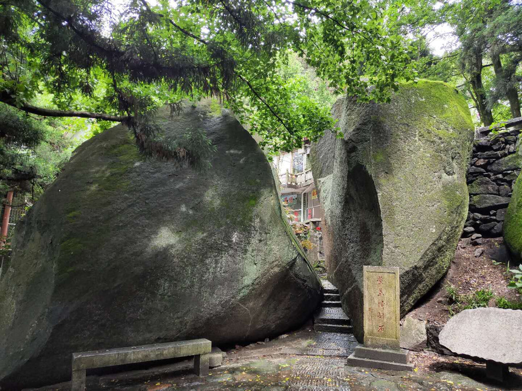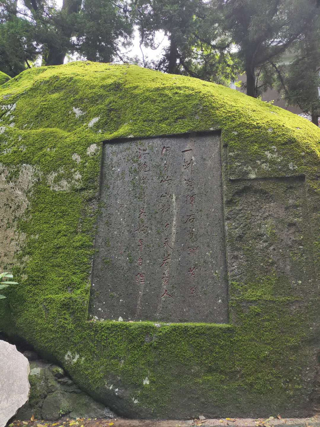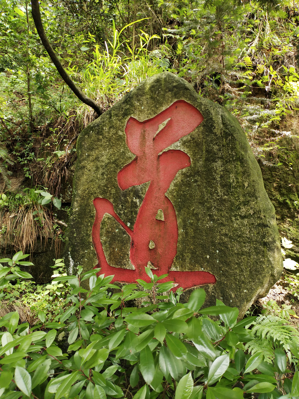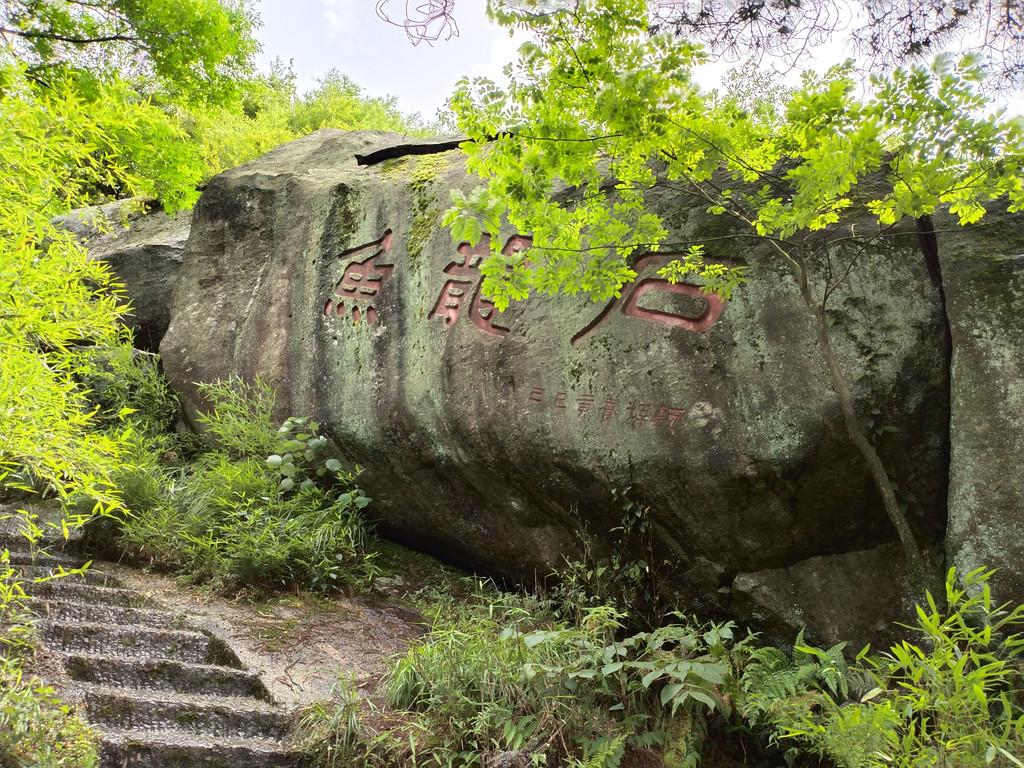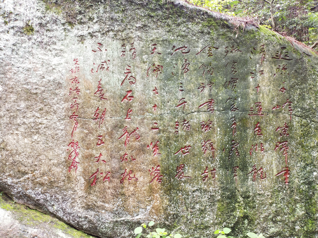 降雨充沛,这个时候早已经进入了雨季,初夏是它们的最佳生长期。林间偶尔见到桃树,一般都不大,可能是人工种植或者自己生长的,春天应该是漫山遍野的花朵,山林里的桃花比平地的更带仙气。露天的石刻随处可见,有的长了青苔,有的被泥土覆盖,有的为树藤掩盖,大部分可以完整看到。为了充分利用山上的资源,有些宣传标语刻到花岗岩上,物尽其用,节约了成本。