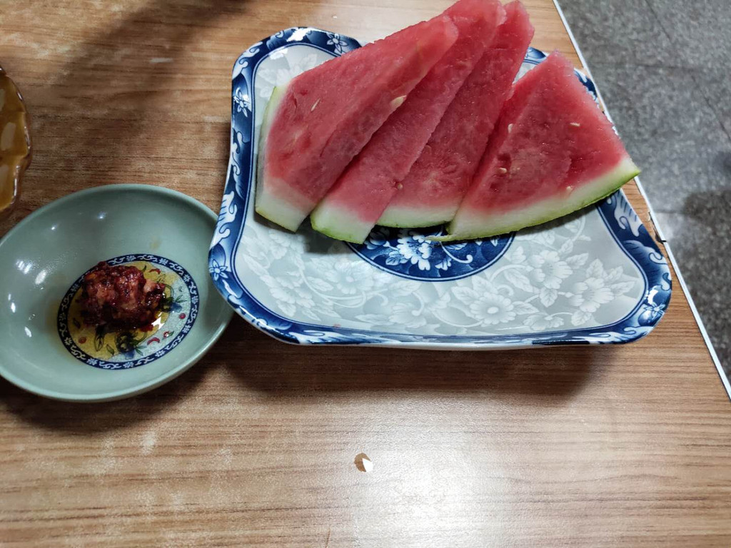 不一会儿下起大雨,凉亭也被打湿,雨停的时候老板也到了,热情的问我们是否去衡山西站。阴天最适合爬山,不燥不热,体力消耗比较大。雨停了我们先在附近的餐馆就餐,路上的行人不多,不少店家卖有香火,围绕着衡山而发展。餐馆的老板会热情询问进店的客人是否上山,帮忙介绍住宿和车辆等。老板很大方,免费赠送西瓜。